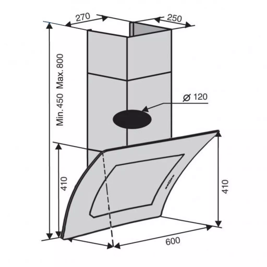 Главное отличие «Monti 60 BK (750) TC» от других моделей заключается в необычном дизайне. Вытяжка изготовлена с прочного черного стекла, которое вогнуто в средину. Благодаря такому решению рабочая зона кажется более просторной.
