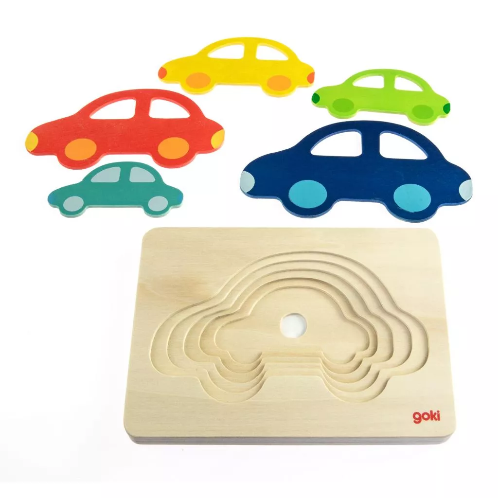 Пазл состоит из деревянной основы и пяти машинок, отличающихся по цвету и размеру.