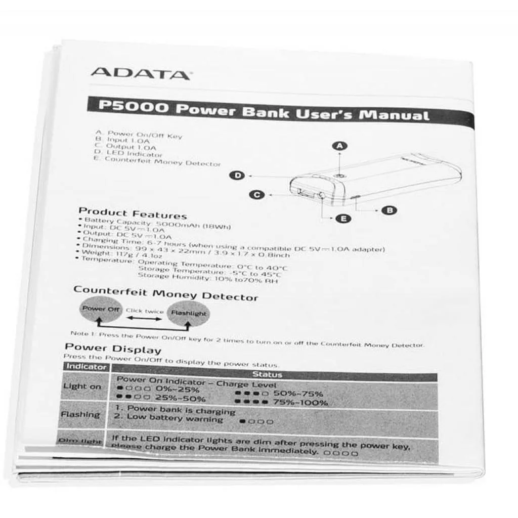 Батарея универсальная ADATA P5000 Black (5000mAh, 5V*1A, cable) (AP5000-USBA-CBK)