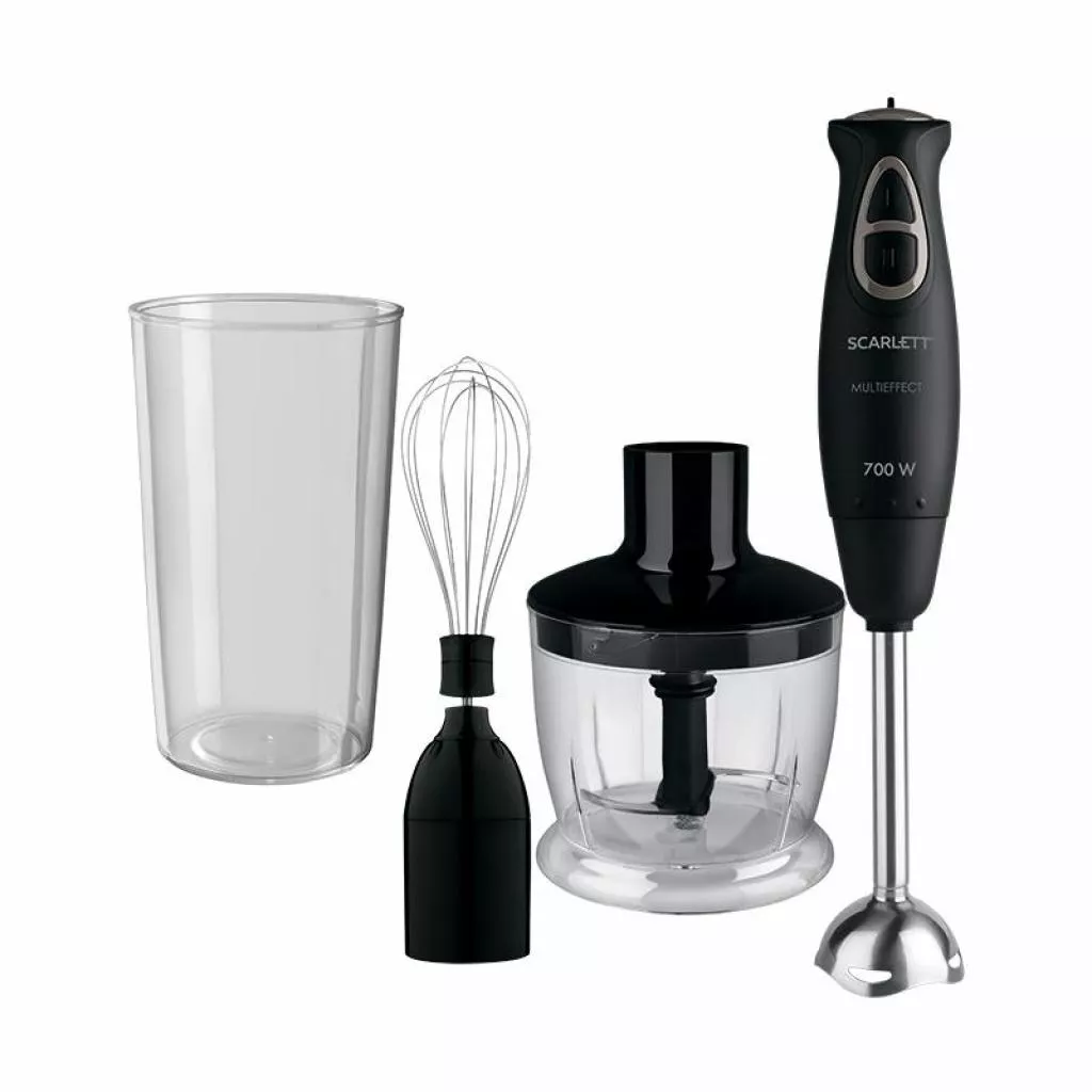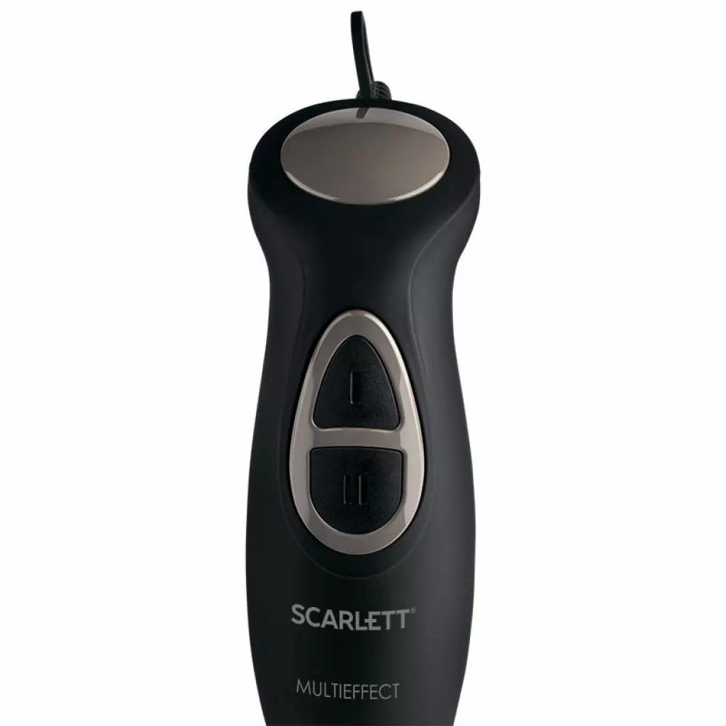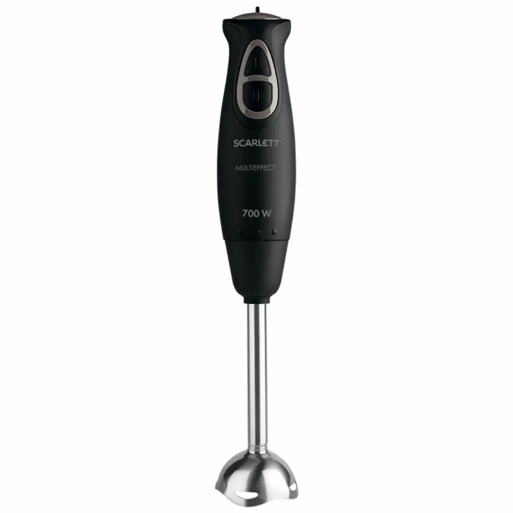 Компактный погружной блендер от компании Scarlett мощностью 700 Вт оснащен 2 скоростями работы и имеет ножи из высококачественной нержавеющей стали.