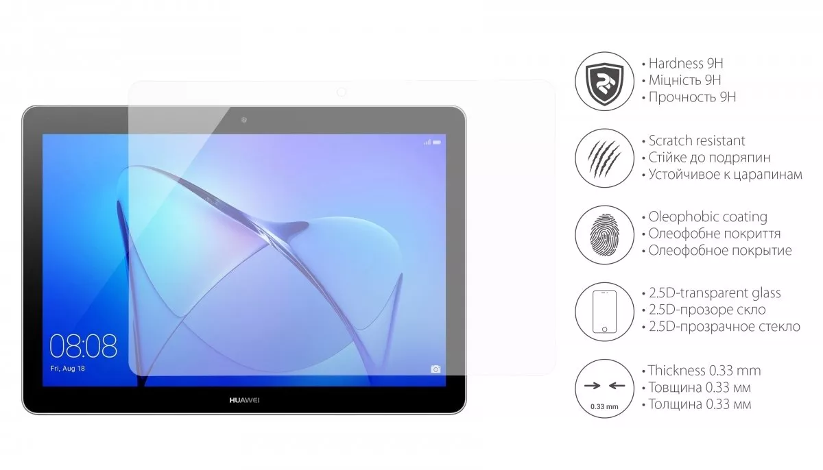 Стекло совместимо с моделью Huawei MediaPad T3 10. Комплектация: защитное стекло, салфетка из микрофибры, стикер для удаления пылинок с экрана, салфетка для протирки. Защитные свойства: плотность 9H, толщина 0.33мм. Стекло ведущих японских производителей Luobo с олеофобным покрытием.