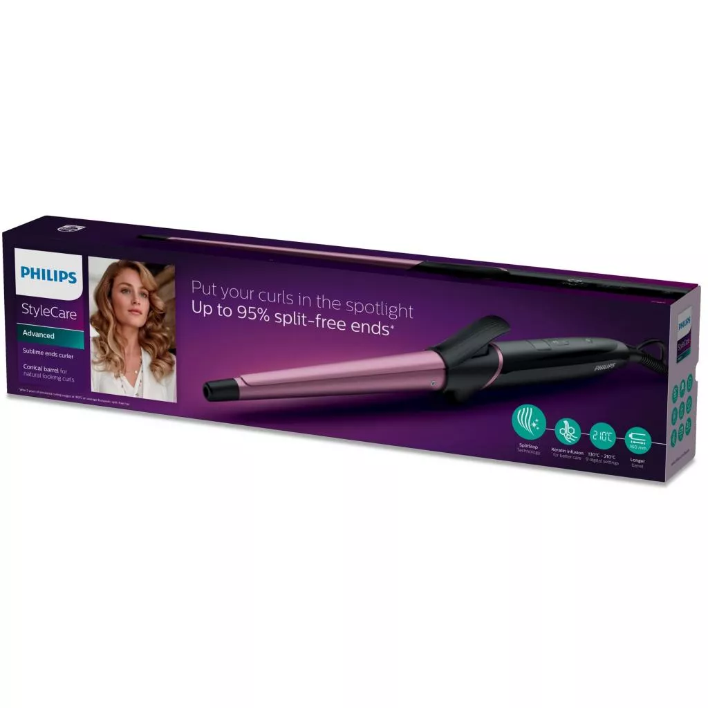 До 210 °C. Высокая температура укладки позволяет создать любую прическу и придать локонам великолепный вид. Подставка для безопасности. Подставка обеспечивает безопасность при использовании щипцов для завивки.