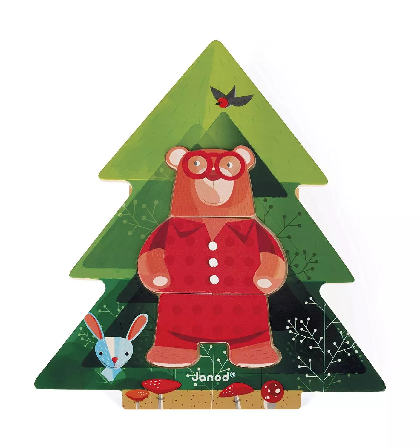 Головоломки - простая в использовании, но очень интересная и веселая игрушка. «Пижамная вечеринка» от Janod - это деревянный пазл с симпатичным медведем на фоне лесной красавицы-елки. Детали пазла вполне безопасными для детей, всего в комплекте 18 элементов. Все части удобно хранить в компактной коробке. Собирая пазл, ребенок развивает фантазию и мелкую моторику рук. Кроме того, малыш может комбинировать наряды для господина Медведя и придумывать новые образы. Размер пазла: 20 х 22 х 7,5 см.