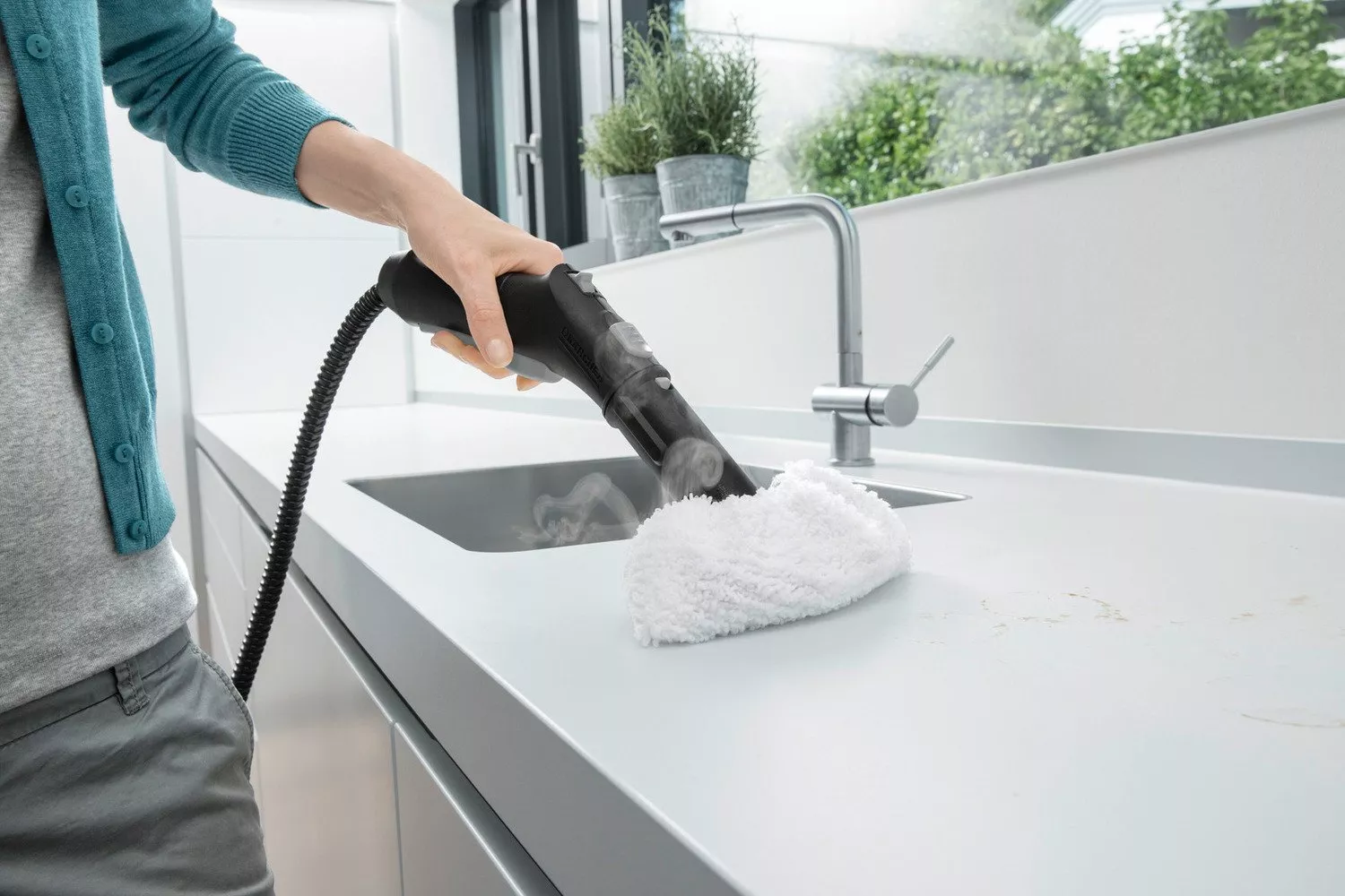 Пароочиститель Premium SC 2 Deluxe EasyFix оснащен универсальными принадлежностями: в дополнение к стандартным аксессуарам, которые можно хранить в дополнительном длинном пакете или непосредственно на устройстве, оснащен дополнительной салфеткой из микрофибры для насадки для уборки пола, мощным соплом и большой круглой щеткой. . Благодаря этим аксессуарам, плитка, плита, вытяжные шкафы и даже самые маленькие зазоры будут гигиенично чистыми. При использовании компактного парового очистителя начального уровня SC 2 Deluxe EasyFix Premium, не требуется никаких химических веществ, при этом удаляются 99,99% известных в быту бактерий на твердых поверхностях. Кроме того, пароочиститель обеспечивает двухступенчатое регулирование пара для адаптации интенсивности пара к поверхности и уровню загрязнения и оснащен инновационным светодиодным кольцом на корпусе для отображения режима работы. Красный цвет означает, что он нагревается, зеленый - указывает, что устройство готово к использованию. Новая насадка для пола EasyFix снабжена застежкой-липучкой, позволяющей закреплять микроволоконные салфетки, не наклоняясь к полу – достаточно просто прижать насадку к салфетке.