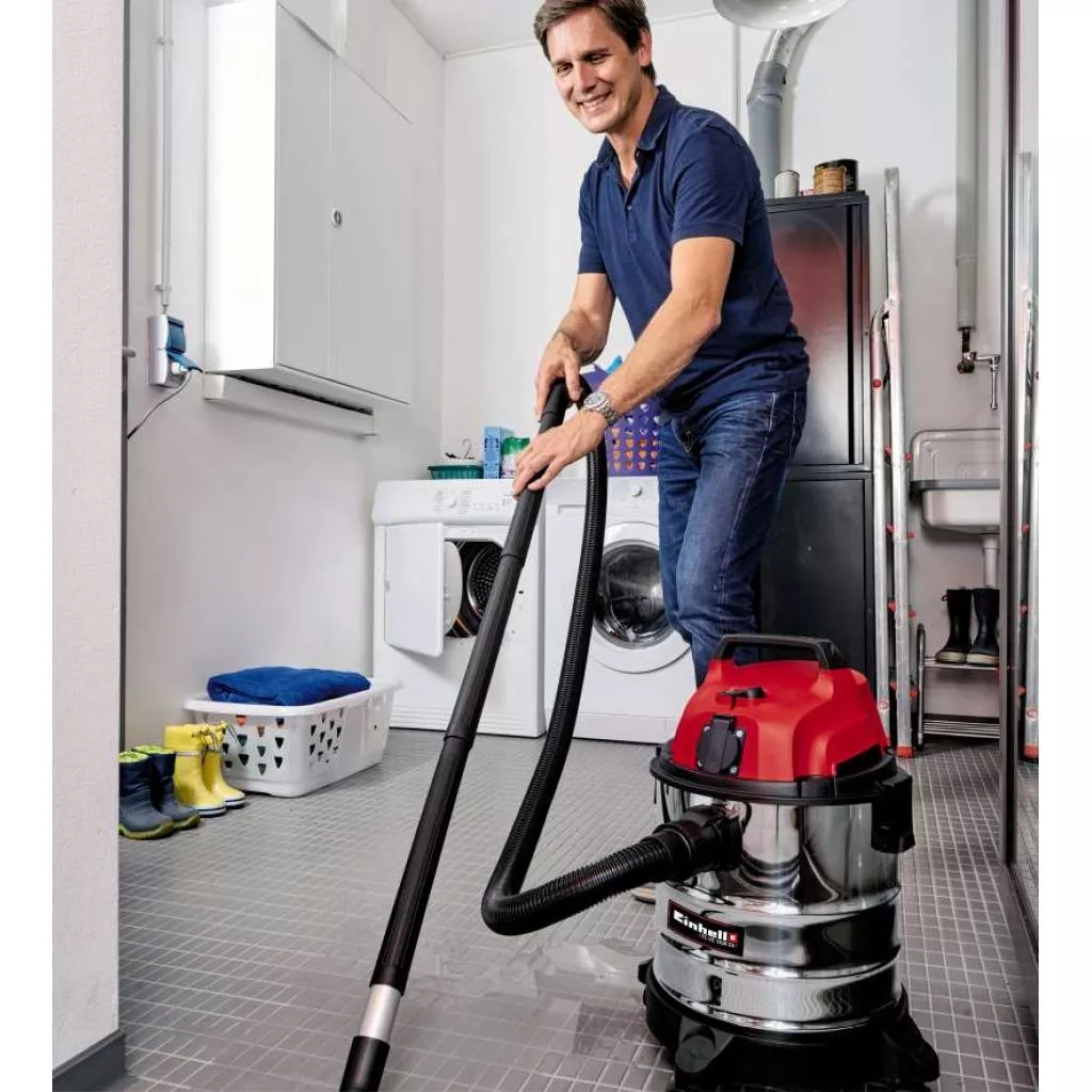 Новый вакуумный пылесос является высококачественным универсальным многоцелевым пылесосом. Вы можете использовать его для сухой и влажной уборки (засасывание разлитых жидкости), а также для работы вместе с электроинструментом Einhell . Его двигатель достигает высокого уровня всасывания 180 мБар. 2х-полосная система для отработанного воздуха и охлаждения двигателя чистым воздухом снижает нагрузку на двигатель.