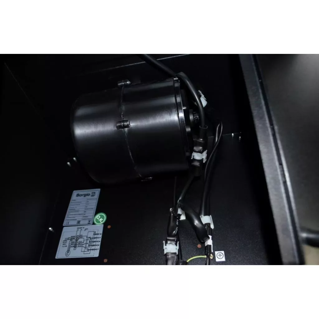 Модель Borgio RNT-SG характерна выдвинутой вперёд дверцей. Фасады наклонных вытяжек TM Borgio выполнены из закалённого стекла, чёрного, белого или бежевого, а также оснащённые LED Block освещением, что придаёт им неповторимый стильный и современный вид. Тип управления кнопочное. Управление позволяет включать/ выключать подсветку, переключаться между скоростями работы вытяжки. Мощность Borgio RNT-SG составляет 850 м3, а максимальный шум при этом на 3 скорости всего 63 дБ.