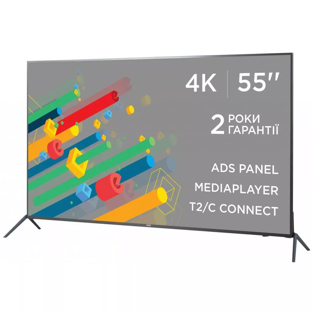 Телевизор ERGO LE55CU5030AK с 55'' дисплеем удачно дополнит любой интерьер, а благодаря разъемам под кронштейн стандарта VESA 400x200 телевизор можно разместить как на подставке, так и на стене.