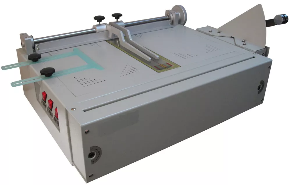 Машина настольного типа, предназначена для автоматизации изготовления обложек для фотокниг и переплетных крышек.