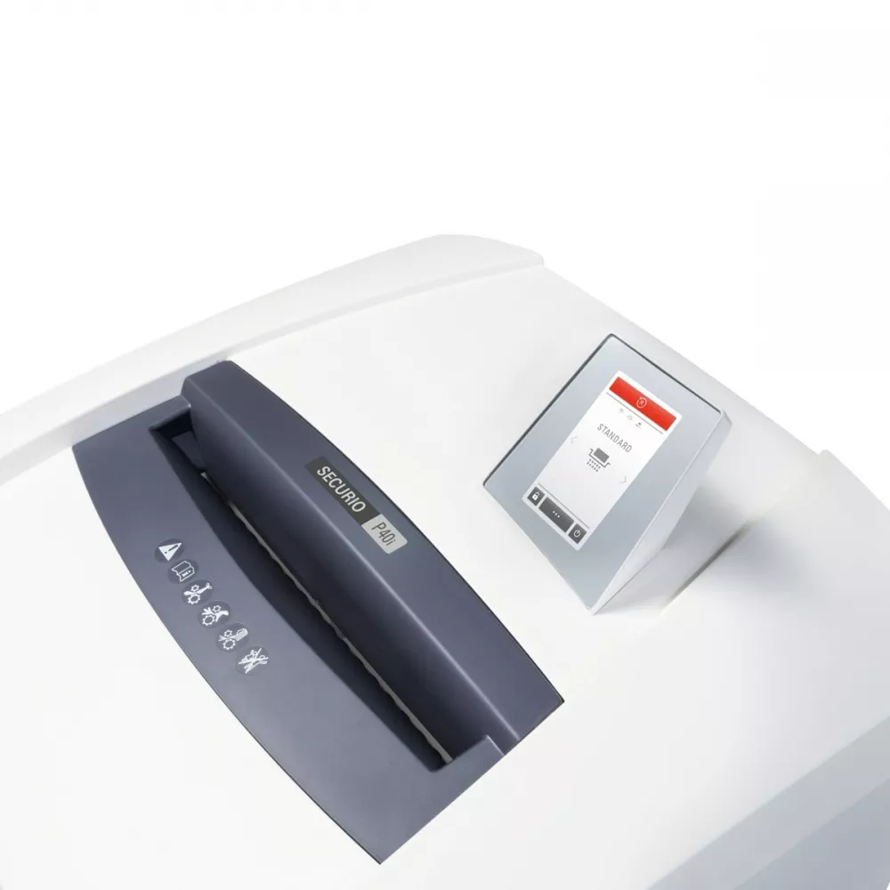 Уничтожитель бумаги, шредер HSM Securio Р40 (4, 5х30) . Перекрестная резка: 4, 5х30мм; Уровень секретности: 4; Уничтожает за раз: 37 листов; Ширина реза: 330мм; Уничтожает пластиковые карточки, CD, дискеты; Объем корзины: 145л; Мощность: 2100Вт; Габариты HSM Securio P40: 580х550х936мм; HSM, Германия