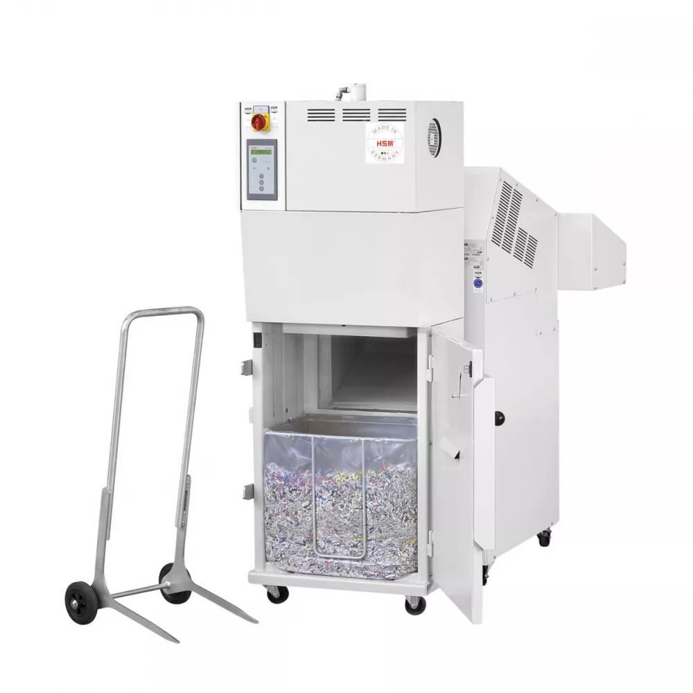 Комбинация Уничтожитель + прессупаковщик позволяет достичь максимальной эффективности процесса уничтожения, так как после измельчения бумажный материал очень рыхлый и имеет большой объём. Компания HSM решила эту проблему скомбинировав Шредер и пресс-упаковщик в законченную полуавтоматическую линию. На выходе получаются аккуратные тюки измельчённого материала уменьшенные в 10-20 раз от первоначального объёма, что экономит место временного хранения, удешевляет погрузочно-разгрузочные работы, транспортные расходы, а также повышает пожарную безопасность места хранения отходов. • функция отключения при переполненном контейнера или камеры прессования • авто-реверс при застревании бумаги • удобный ленточный транспортер для загрузки бумаги • возможность уничтожения документов вместе с папками-скоросшивателями • Возможность уничтожения пластикових картотек, floppy 3,5” и CD- дисков • образцовая операционная эффективность вследствие оптимальной конструкцией двигателя и геометрии системы резки, • режущие элементы сделаны из специальной стали с высоким содержанием хрома, закаленой на глубину до 1 мм и обладающие высокой прочностью, • испытанный, очень надежный двигатель с цепной передачей обеспечивает максимальную производительность • прессование отходов либо в полиетиленовые мешки, либо в картонные коробки. Звездочка (*) в наименовании товара означает "Товар под заказ", цена составлена ориентировочно и будет зависеть от курса Евро/Доллар на момент заказа и от условий поставки.
