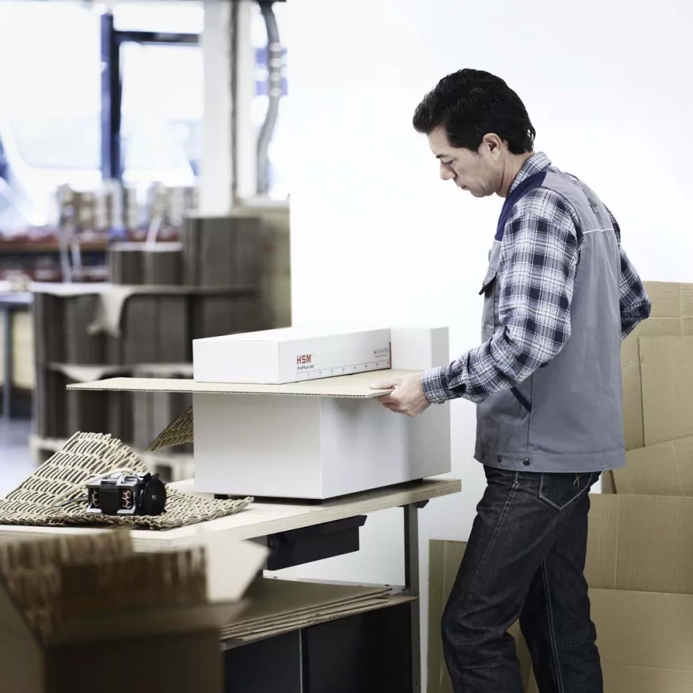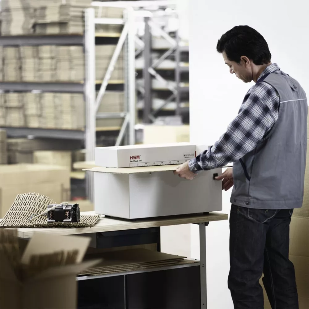 Эта высокопроизводительная упаковочная машина за один шаг превращает использованный многослойный картон на прокладку или амортизирующий упаковочный материал-наполнитель. Настольное исполнение позволяет использовать это устройство, как переносной, для максимального удобства использования.