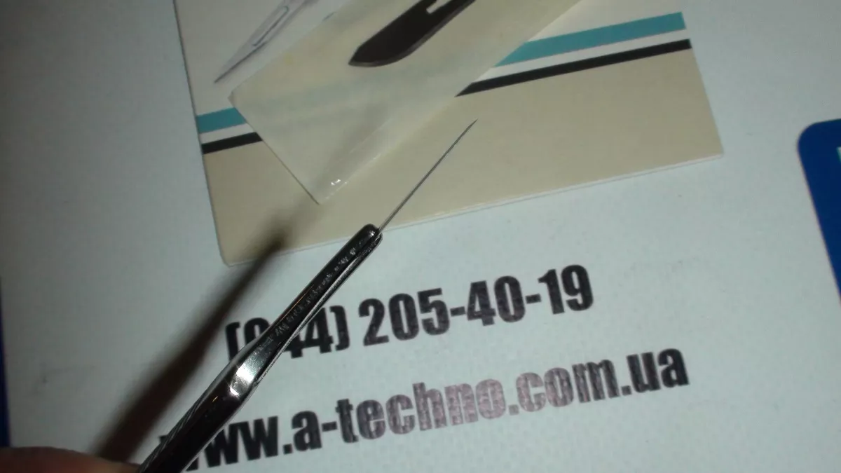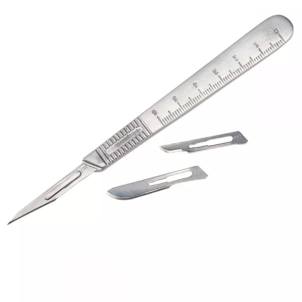Металлический макетный нож с миллиметровой насечкой на ручке, позволяющий устанавливать различные лезвия. В комплекте три сменных лезвия №10, 11, 15.
