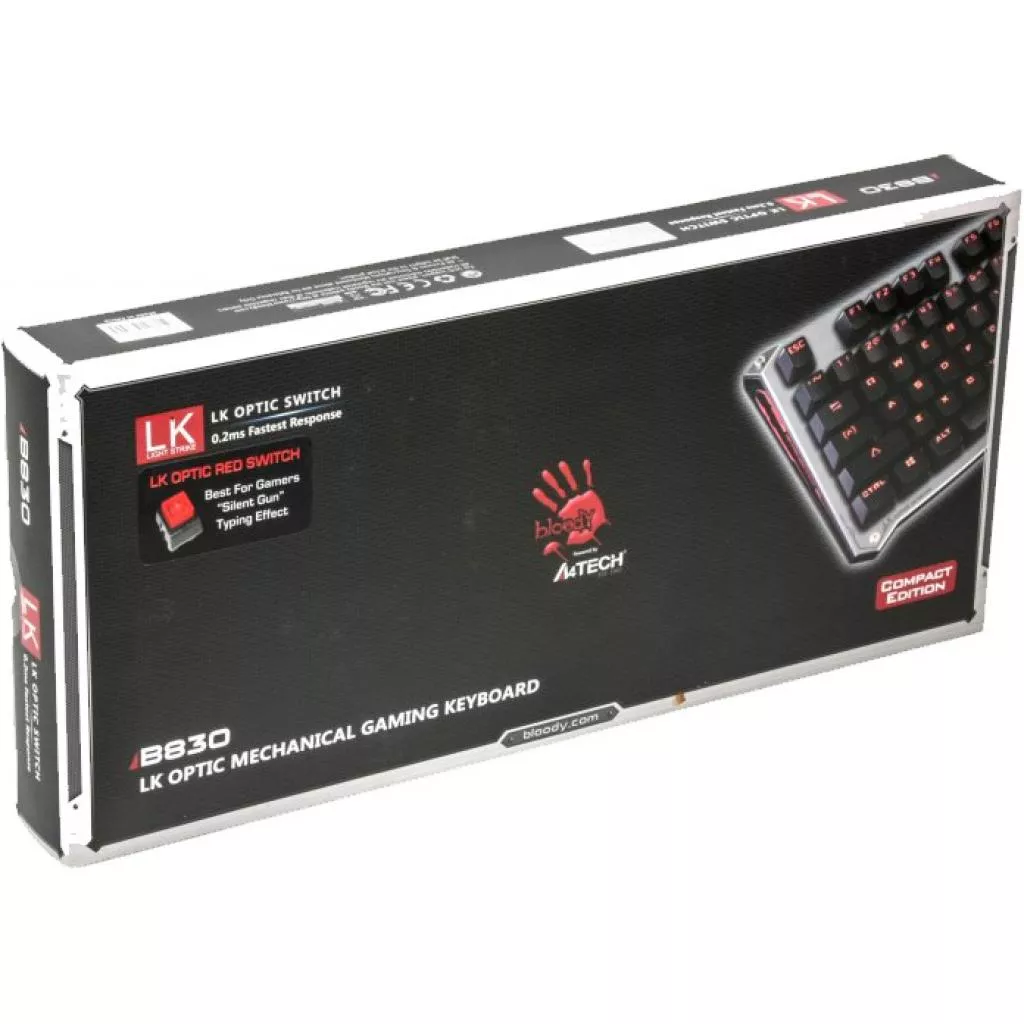Bloody B830 USB — самая быстрая игровая клавиатура в мире с механическими переключателями на игровых клавишах. Технология Light Strike. Инновационная технология LK (Light Strike) использует оптические переключатели, обеспечивающие непревзойденное время отклика 0.2 мс! На 25% более быстрое нажатие клавиш. Ход срабатывания — с расстояния 3 мм, что на 25% быстрее, чем у металлических переключателей (у обычных металлических переключателей ход срабатывания начинается с расстояния 4 мм).