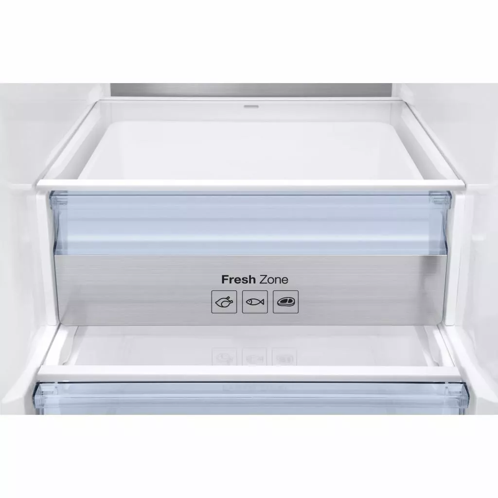 Комфортное хранение. Нижнее размещение морозильной камеры с тремя выдвижными пластиковыми боксам, отлично подходит для частого использования и позволяет рационально размещать и легко доставать продукты. Холодильная камера оснащена полками из закаленного стекла, вместительным боксом свежести, обеспечивающим комфортный режим для хранения овощей и фруктов, а также охлажденных мясопродуктов и рыбы.