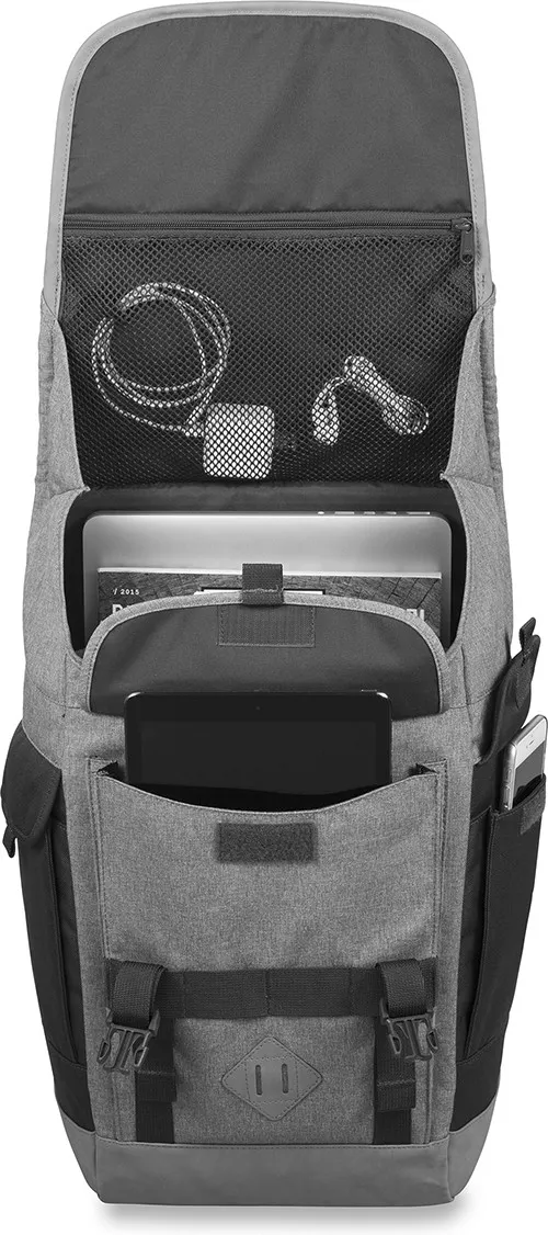 Рюкзак мужской DAKINE Vault прекрасно сочетает в себе функции традиционного городского рюкзака. Рюкзак имеет очень стильный внешний вид и просто идеален для ношения в городе или для путешествий. Данная модель выполнена из уникальной прорезиненной ткани, которая быстро высыхает, великолепно сохраняет форму, устойчива к световому и тепловому воздействию, не промокает и проста в уходе. Лямки рюкзака сделаны очень качественно для того, что можно было носить тяжелые вещи и не бояться, что вдруг рюкзак порвется. В рюкзаке имеется большое вместительное отделение под ноутбук до 17 дюймов. Благодаря откидной крышке в него также легко может влезть пару пар обуви или роликовые коньки. С одной стороны расположен карман на молнии, внутри которого отделение из сетки для воды. С другой стороны глубокий карман на липучке в который поместится мобильный телефон, и всякие мелкие, но при этом очень нужные предметы. Благодаря клапану возможно увеличение пространства. Для фиксации эргонометричной формы рюкзака по бокам расположены утяжки. В дополнении есть и карман органайзер, который подойдет для письменных принадлежностей, всякой мелочевки, и других полезных вещей. Благодаря вентилируемой спинке носить рюкзак очень приятно даже в самую жаркую погоду. Классический дизайн, минимум деталей – вот что делает этот рюкзак неповторимым.