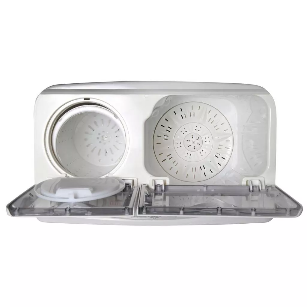 Это полуавтоматическая стиральная машина активаторного типа. Стирка происходит в основной емкости, предназначенной для загрузки 6,5 килограммов белья. После стирки мокрое белье нужно переложить во второй бак с центрифугой для отжима Процесс стирки осуществляется вращением вала с лопастями (вращающегося диска), что обеспечивает перемешивание белья с водой и стиральным порошком. В процессе стирки в такой стиральной машине пенообразование не сильное, поэтому вы можете также использовать и стиральный порошок для ручной стирки.