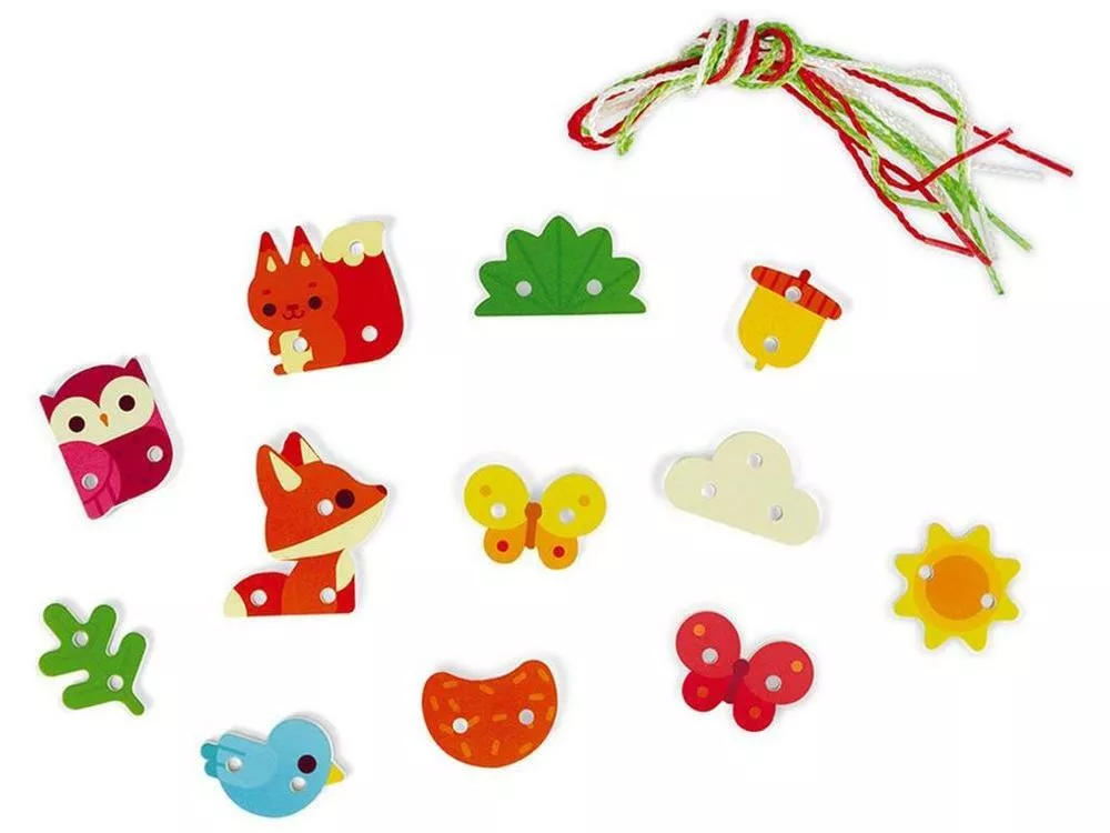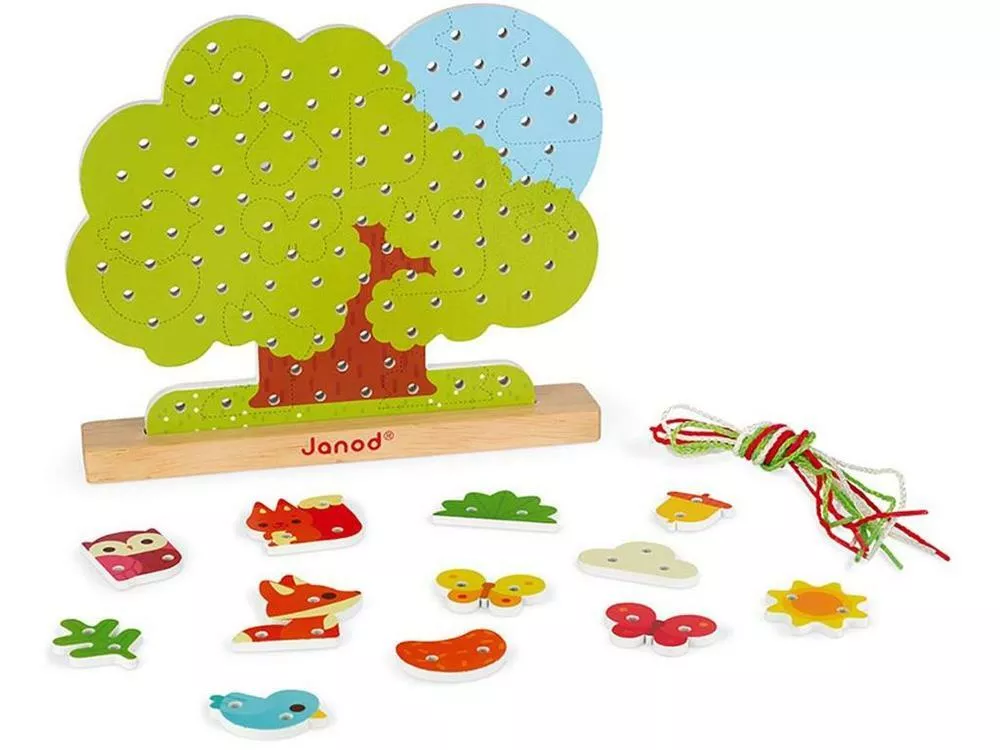 Шнуровка Janod Дерево представляет собой основу в виде дерева и 12 ярких деталей, предназначенных для закрепления на нем. Детали крепятся с помощью шнура, идущего в комплекте. Ребенок может сам найти для них подходящее место.