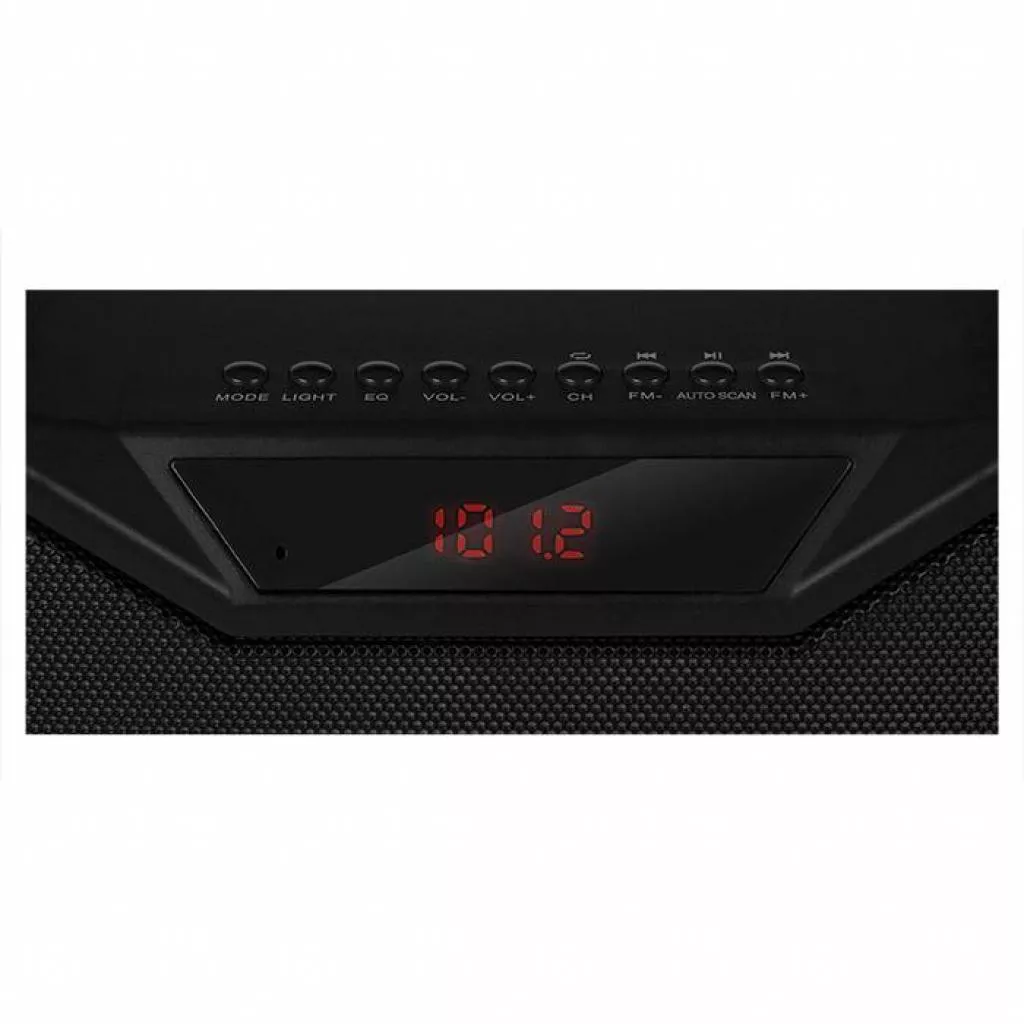 Особенности: глубокий бас благодаря пассивным излучателям. Эффектная разноцветная подсветка. Беспроводная передача сигнала по Bluetooth. Воспроизведение музыки с USB flash и microSD card памяти. LED-дисплей. Встроенное FM-радио. Возможность проводного подключения к источнику звука.