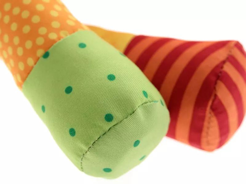Жираф оснащен подвеской, с помощью которой игрушку можно прикрепить к кроватке, коляске, рядом с автокреслом. Веселый жираф не даст ребенку заскучать.