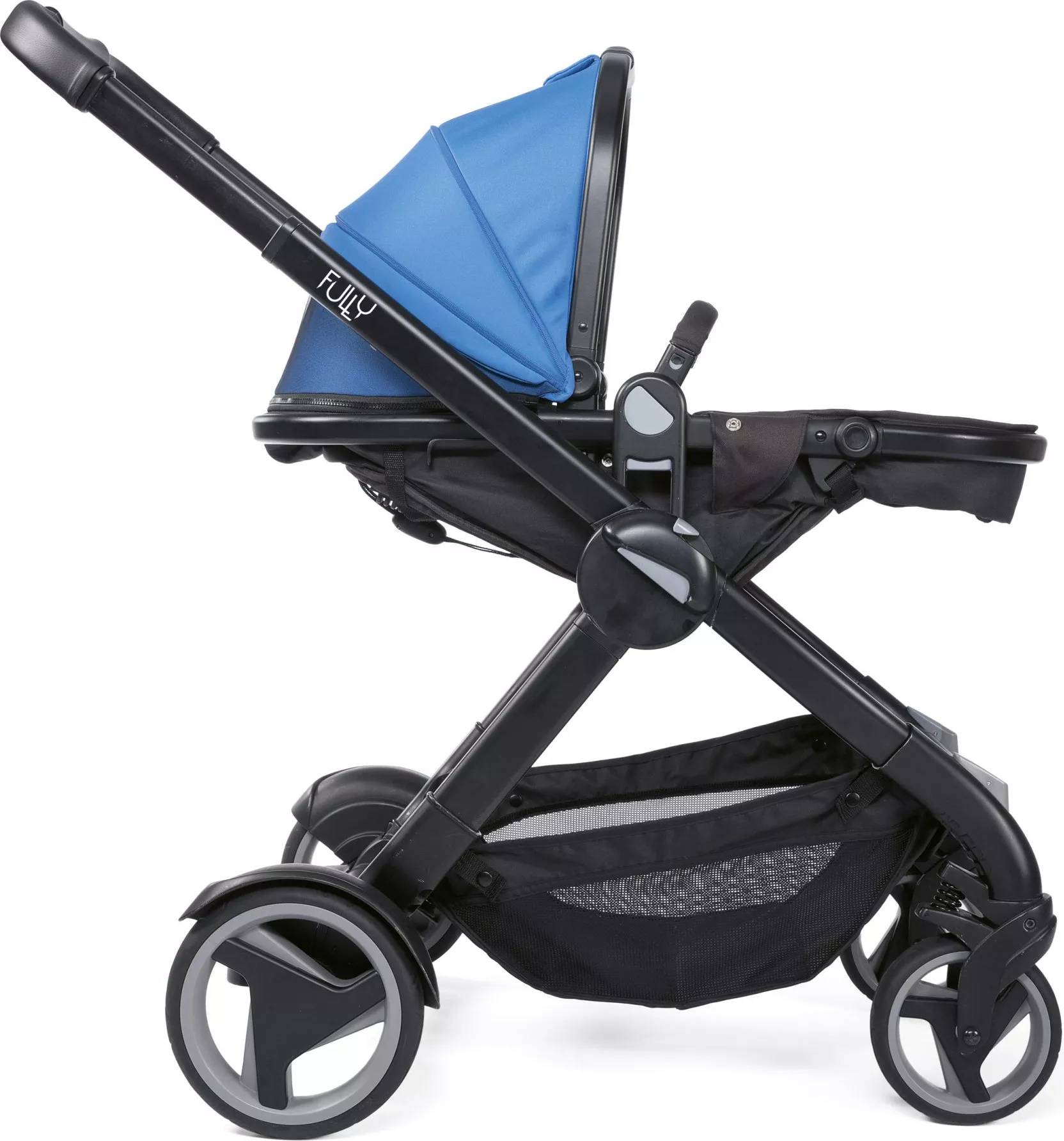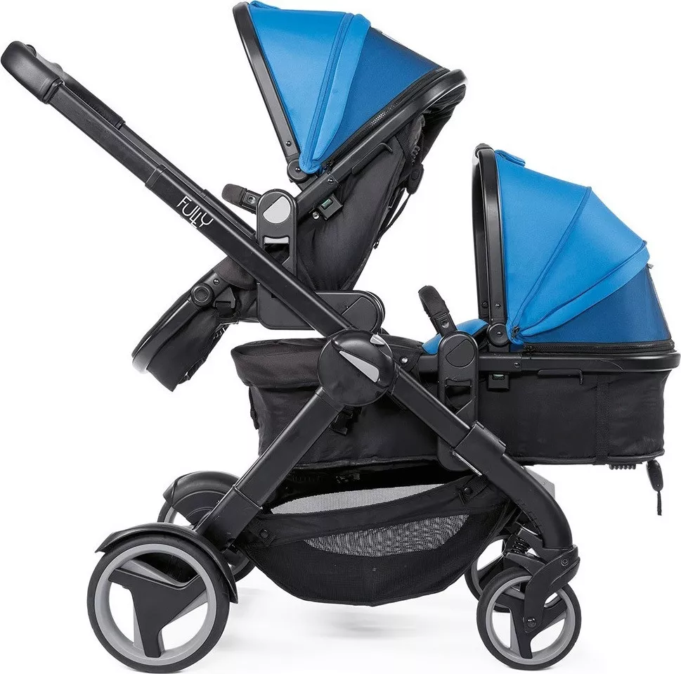 Коляска Fully Twin с двумя реверсивными сиденьями, которые легко трансформируются в люльки, и с множеством различных конфигураций позволяет родителям перевозить в коляске не только двойню, но и погодок.