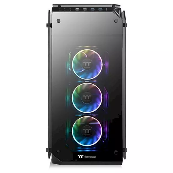 View 71 Tempered Glass RGB Plus Edition является старшей моделью корпусов серии View от Thermaltake. Он имеет достаточно внутреннего пространства для установки материнских плат с форм-фактором вплоть до E-ATX и больших радиаторов системы жидкостного охлаждения спереди, сверху и сбоку. Боковые панели изготовлены из закаленного стекла и крепятся на петлях, что позволяет не только видеть начинку ПК, но и при необходимости иметь к ним легкий доступ. Передняя и верхняя панели также выполнена из закаленного стекла. Штатно в корпус установлены четыре вентилятора 120мм Riing Plus 12 RGB (3 спереди и 1 сзади). Также имется кронштейн для установки видеокарт в вертикальной плоскости (лицом к боковой панели).