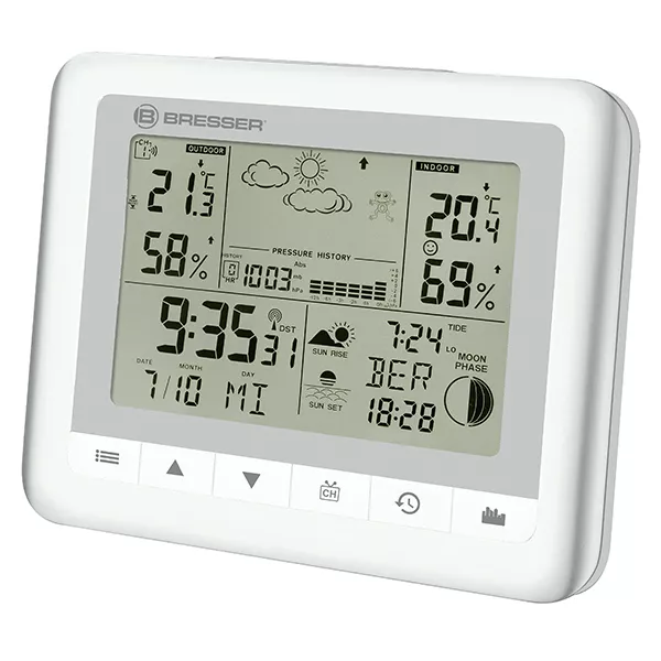 фиксирует изменения барометрического давления и на основании этих изменений выводит на дисплей краткосрочный прогноз погоды на ближайшее время. Также измеряет величину атмосферного давления, температуру и влажность в помещении и на улице.