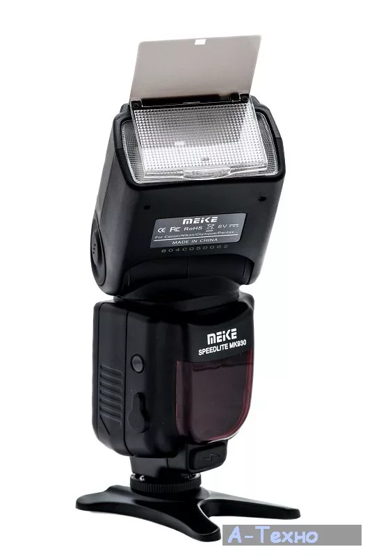 В комплекте имеется специальная подставка, благодаря чему вспышку можно установить как непосредственно на камеру, так и на любую горизонтальную поверхность. Несмотря на большую мощность, универсальная вспышка Meike 930 употребляет малое количество энергии аккумулятора, а удобный батарейный отсек позволяет быстро заменить элементы питания в любых условиях.