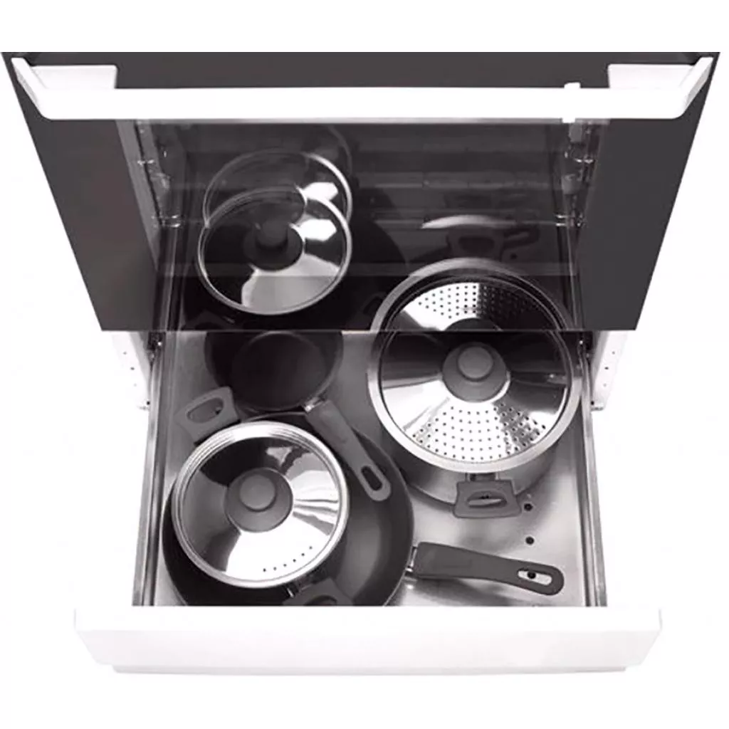 Расположенный под духовым шкафом ящик имеет ролики, благодаря чему его легко выдвигать. Это идеальное место для хранения посуды, кастрюль или сковород.