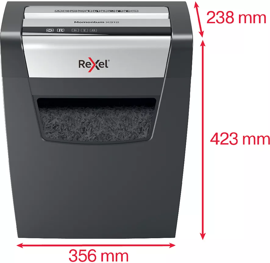 Возможность уничтожать больше! Шредер Rexel Momentum X312 уничтожает до 12 листов за один раз, а время непрерывной работы 6 минут делает его идеальным для использования дома. Модель X312 оснащена технологией анти-замятия, которая гарантирует непрерывное уничтожение документов. Уровень секретности P3, поперечная резка, фрагменты 5х42 мм. Тихий двигатель, простая и интуитивно понятная сенсорная панель управления, а также большая корзина объемом 23 литра (200 листов формата A4).