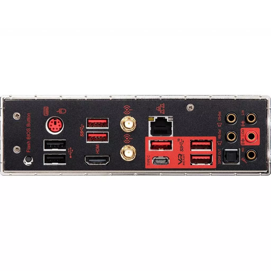 | Внешние порты | 2 х USB 3.2 Gen1, 1 x Flash BIOS Button, 2 x Antenna Ports, 1 x USB 3.2 Gen2 Type-C, 3 x USB 3.2 Gen 2, 1 x RJ45, 2 x USB 2.0, 1 x PS/2, 1 x HDMI, 1 x optical SPDIF out, Audio |