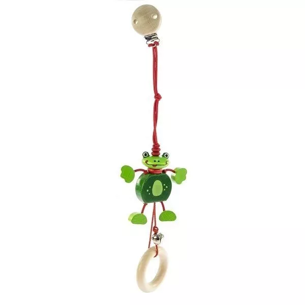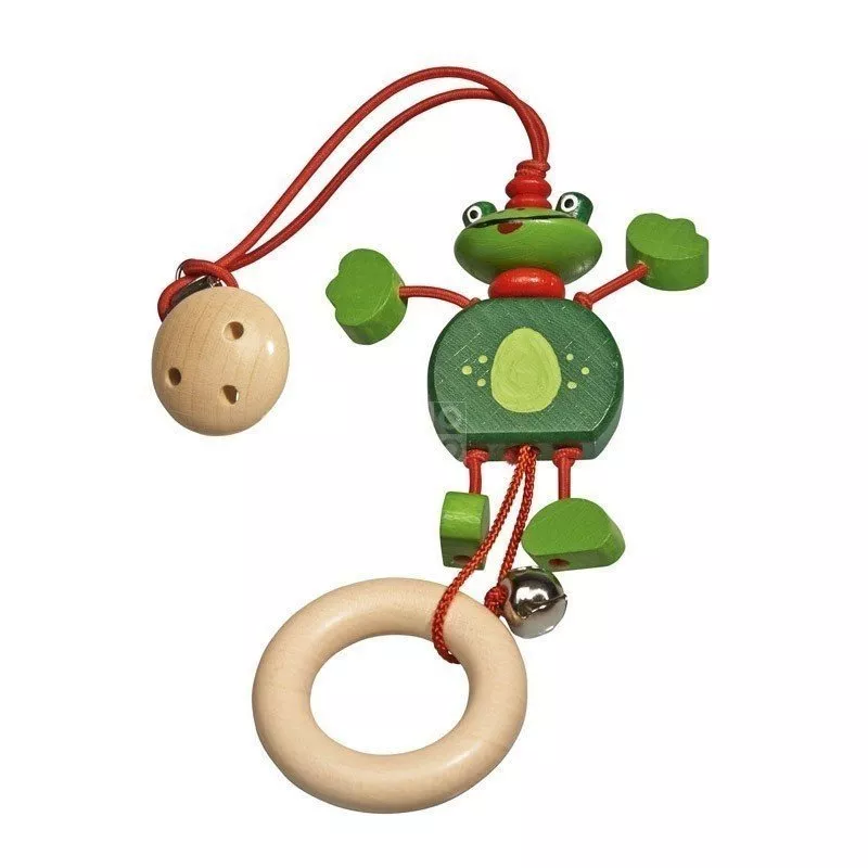 Игры с погремушками для младенцев прекрасно развивают в них зрение и слух. Поэтому погремушки - это необходимая игрушка с первых дней жизни малыша. Экологическая погремушка на клипсе "Жабка" немецкого производителя Nic - аксессуар, который надежно цепляется на кроватку или коляску маленьких. Она произведена из деревянных элементов в натуральных, голубых и зеленых цветах, гибких красных резинок, красного текстильного шнурка, металлического колокольчика и надежной металлической клипсы. Деревянные элементы качественно обработаны и покрыты красками на водной основе, будучи безопасными для игры. Металл, из которого сделаны колокольчик и клипса, гипоаллергенный - весь аксессуар в целом безопасен для здоровья ребенка.