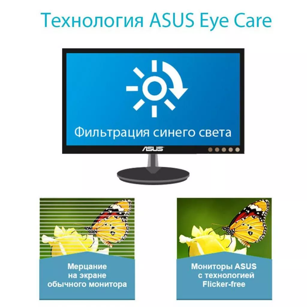 В мониторах ASUS реализуется функция фильтрации синего света, который может оказывать вредное влияние на глаза. Степень фильтрации задается в экранном меню.