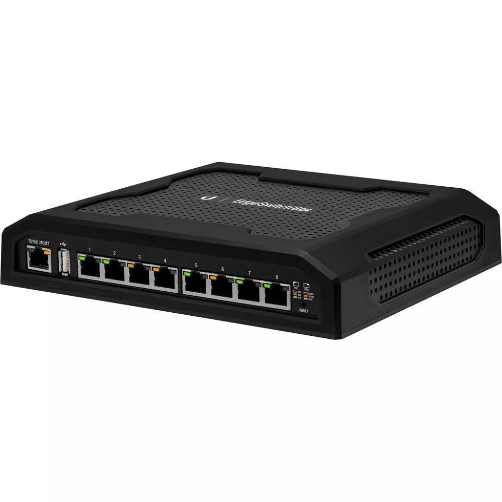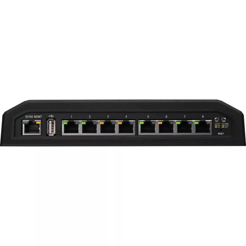 Свитч получил 8 гигабитных Ethernet портов, на каждом из которых возможно организовать раздачу питания PoE 24\48 v. Максимальная мощность передающаяся абонентскому оборудованию на каждом порту достигает 23 вт, при напряжении 48 v и до 11.5 вт при напряжении 24 v. Суммарная же мощность, которую обеспечивает Ubiquit EdgeSwitch 8 XP достигает 145 вт. Энергоснабжение коммутатора обеспечивается встроенным блоком питания с подключением к сети переменного тока 110/220 v. Помимо 8 Ethernet портов, Ubiquit EdgeSwitch 8 XP имеет так же USB 2.0 порт зарезервированный для использования в будущем и консольный порт предназначенный для доступа к интерфейсу управления.
