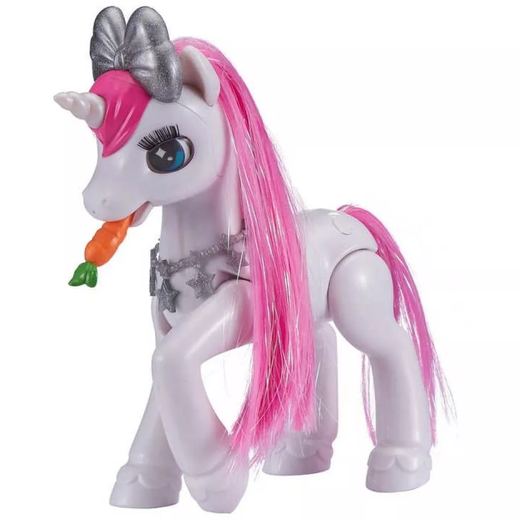 Единорог обладает настоящей магией – он умеет петь, а его рог – светиться и менять цвет! При нажатии на волшебную звёздочку единорог будет повторять Ваши фразы. Игрушка реагирует на прикосновение – погладьте носик единорога, и он сыграет Вам песенку! Подуйте на единорога – и он поцелует Вас в ответ! Он обожает танцевать под свою собственную музыку и лакомиться морковкой. Еще его грива нуждается в регулярном уходе, поэтому не забывайте ее расчесывать.