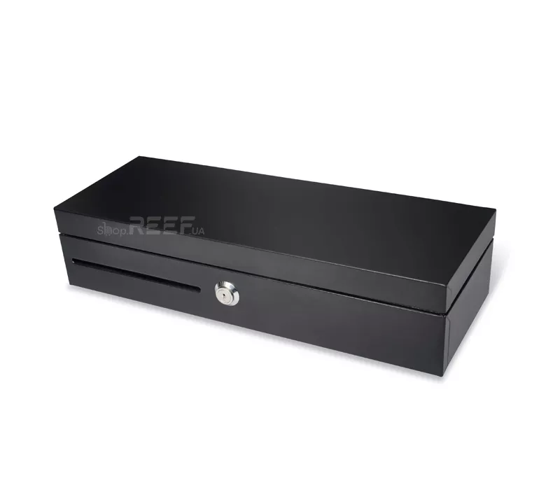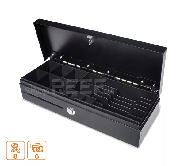Стальной денежный ящик с вертикальной крышкой. Цвет черный. Имеет 6 отделений для банкнот и 8 - для монет и 1 отделение для документов A5 (чеков, счетов). При пересменке имеет функцию закрытия на ключ сменной кассеты для безопасной транспортировки в главную кассу. Прочные металлические петли обеспечивают надежное крепление верхней крышки.