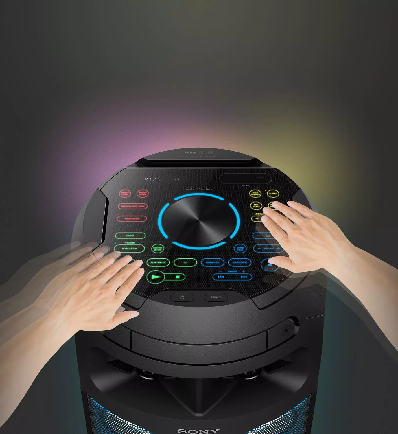 Переключайте треки, включайте фланжер или эффект «вау-вау», увеличивайте громкость микрофона для караоке, настраивайте тональность микрофона и музыки, а также управляйте громкостью с помощью вертикального или горизонтального взмаха руки. Управление жестами позволяет контролировать систему MHC-V72D, не отвлекаясь от вечеринки.