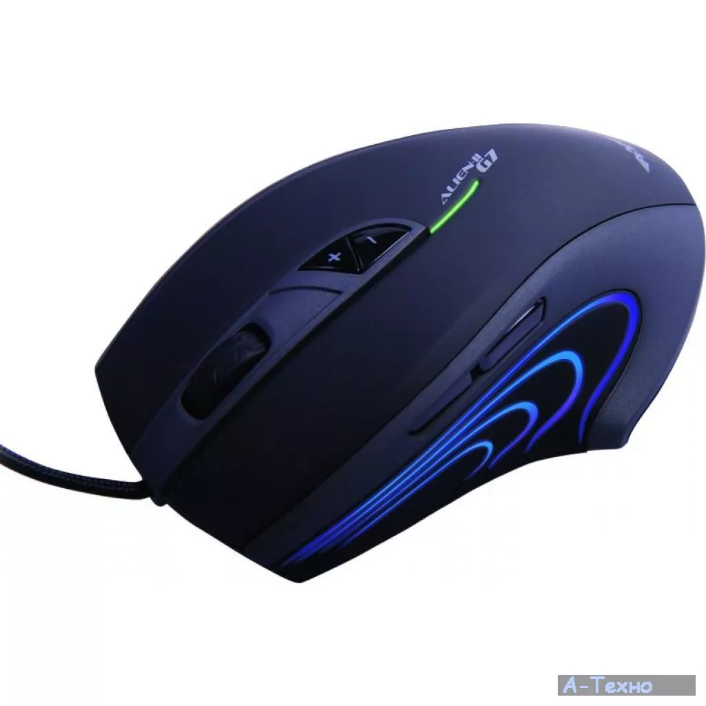 - стильная компьютерная мышь. Прорезиненное покрытие обеспечивает хороший контакт с рукой, Armaggeddon Alien II G7 C.Blue имеет кнопку смены разрешения на лету, которая позволяет изменять его ступенчато 400-800-1600-3200 cpi. Чтобы сменить разрешение мышки, теперь не нужно делать пауз в игре. В мышке Armaggeddon Alien II G7 C.Blue есть возможность сохранять макросы для дальнейшего использования на любом компьютере, благодаря предустановленной памяти 64 КБ. Тефлоновые ножки высачайшего качества обеспечивают лёгкое скольжение мыши по поверхности. В комплект входит запасной набор ножек.