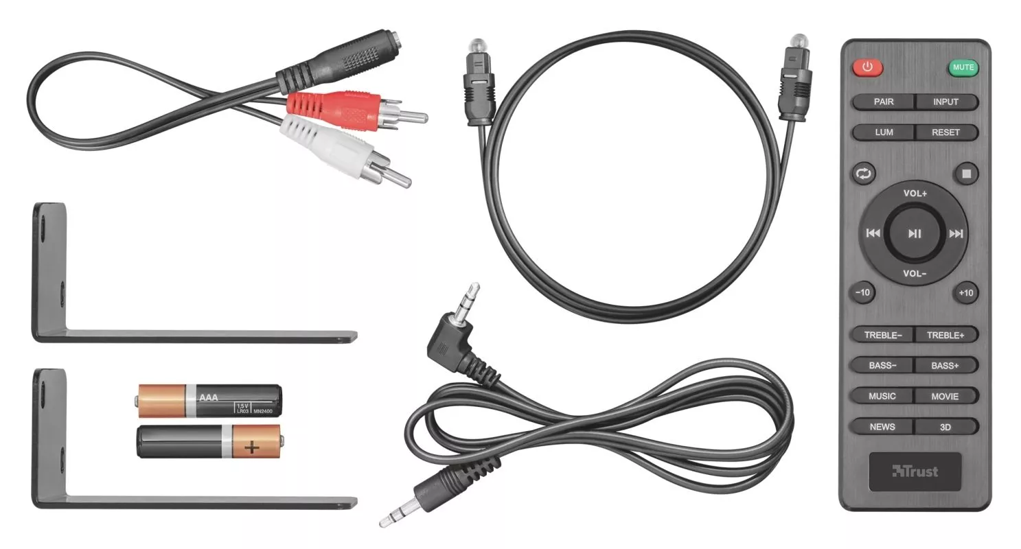 Комплект поставки | 2 батарейки AAA, 2 настенных крепления, 3.5 мм аудио-кабель, адаптер RCA 3,5 мм, Кабель питания, оптический аудио кабель, пульт ДУ |