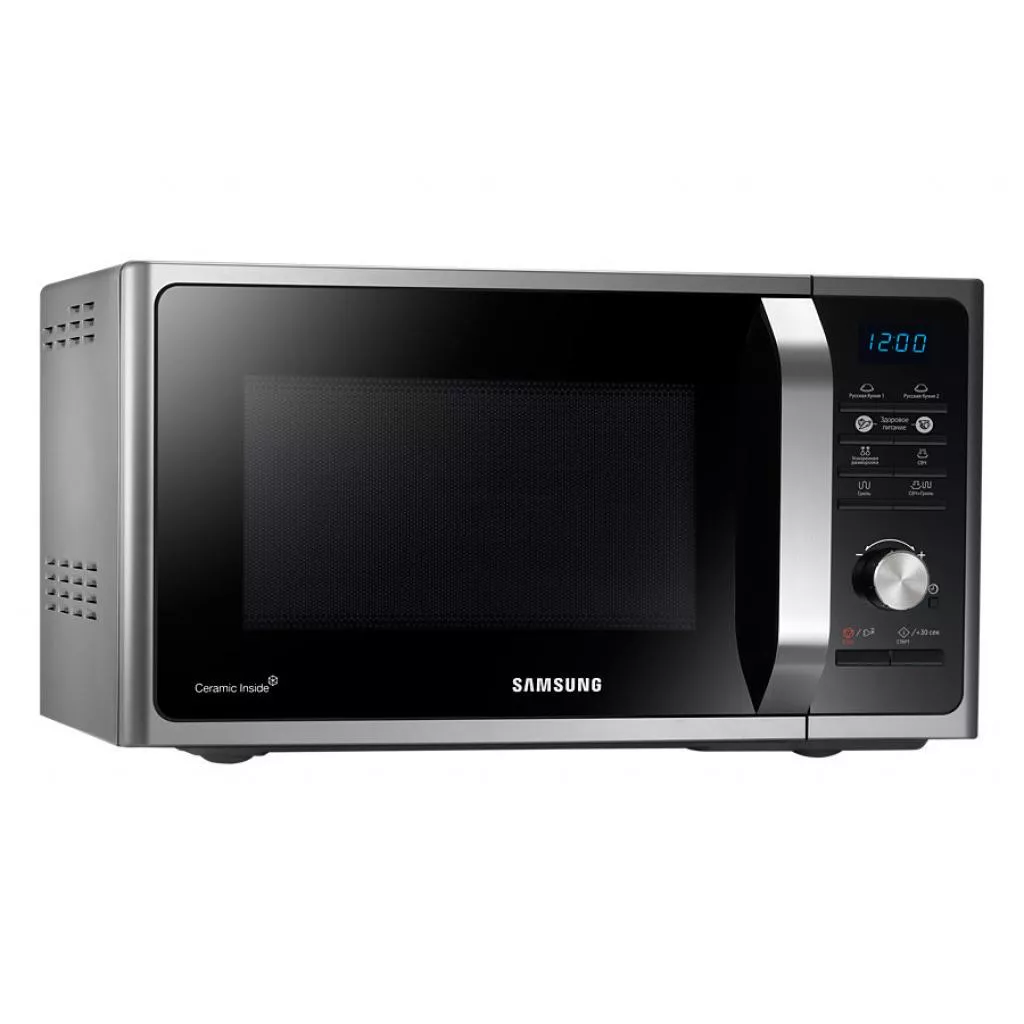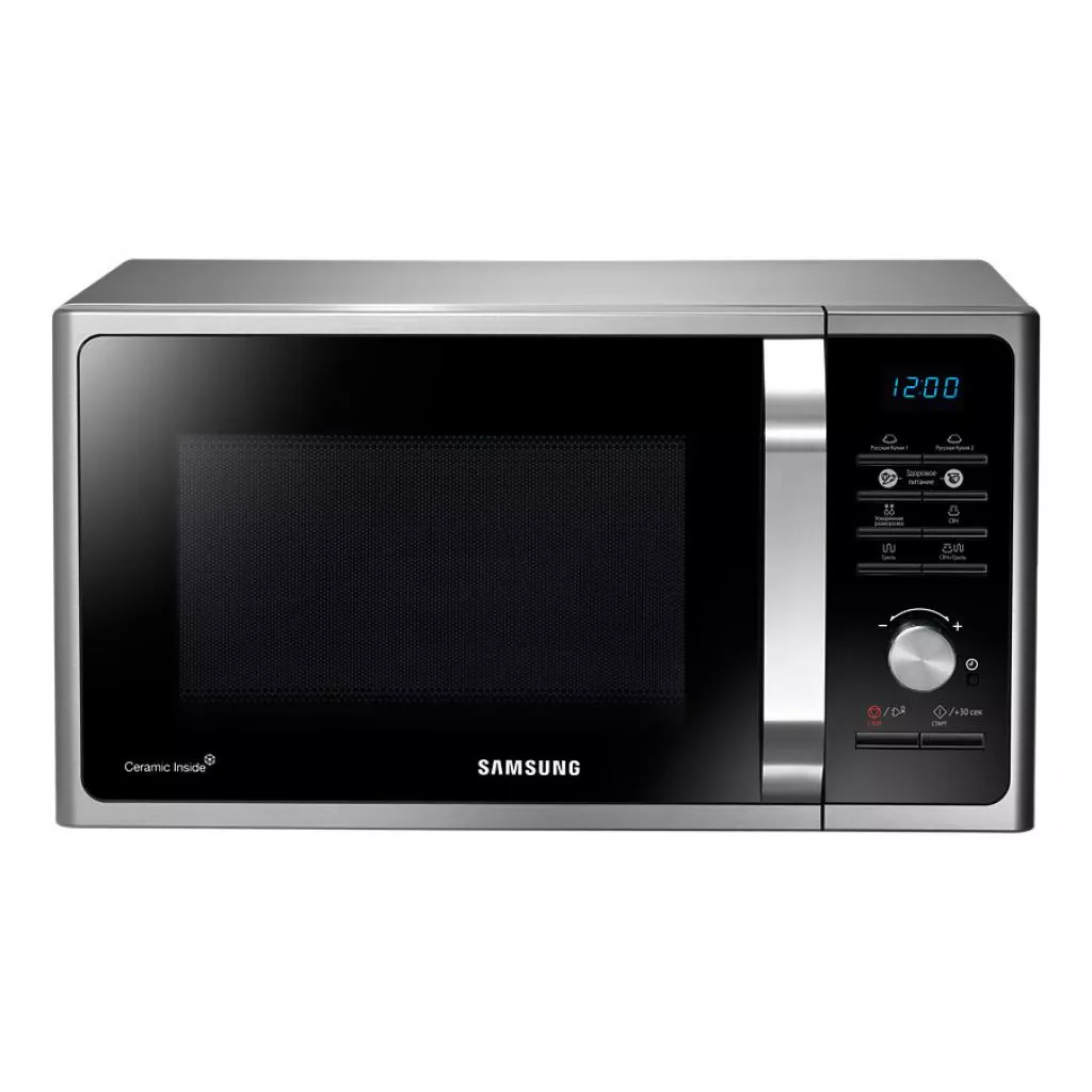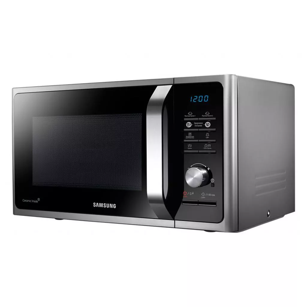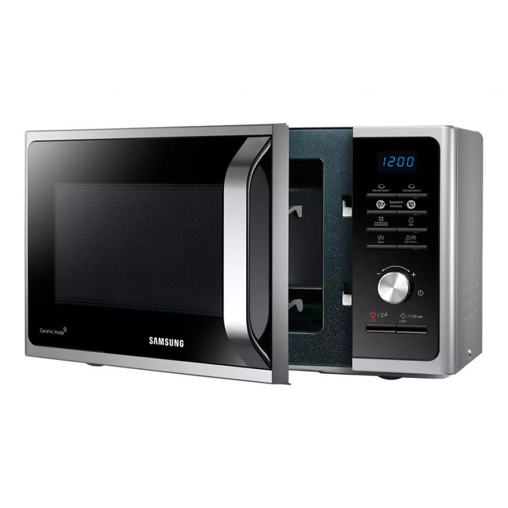 Новая микроволновая печь MS23F302TAK со стильным дизайном, лицевой панелью из черного стекла, красивым дисплеем синего свечения и серебристым переключателем станет украшением вашей кухни.