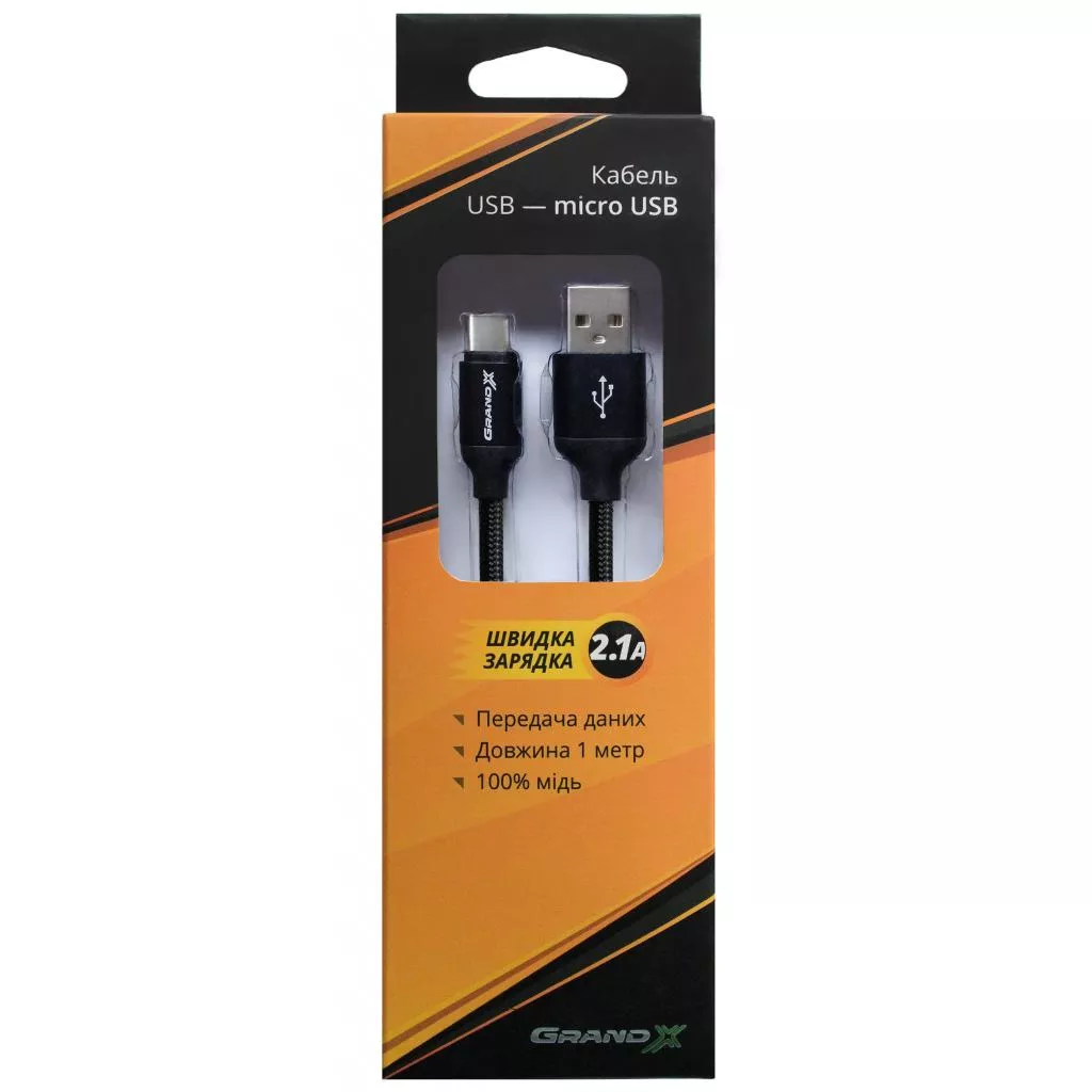 Дата кабель Grand-X USB - micro USB, Cu, 2.1A, Black/Black, 1m (NM01BB)