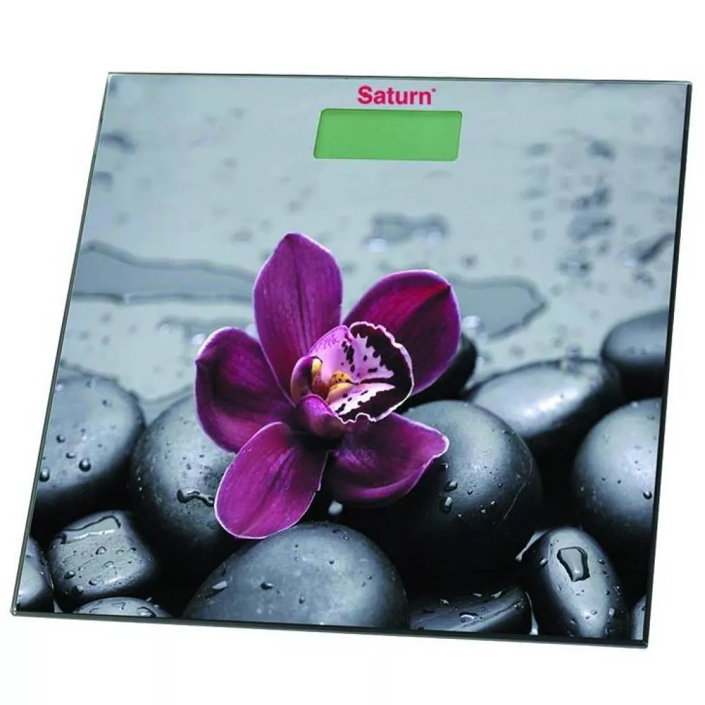 Весы напольные SATURN ST-PS0238 оснащены стеклянной платформой с оригинальным рисунком и оборудованы жидкокристаллическим дисплеем, отображающим результаты измерений.