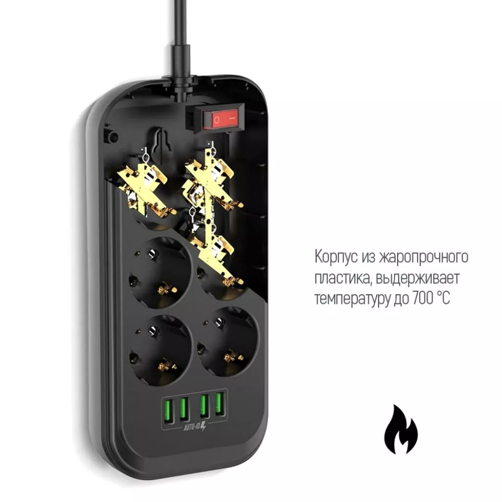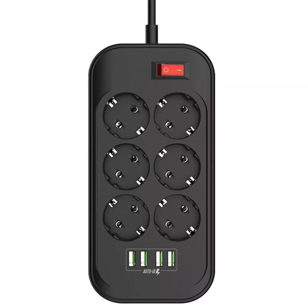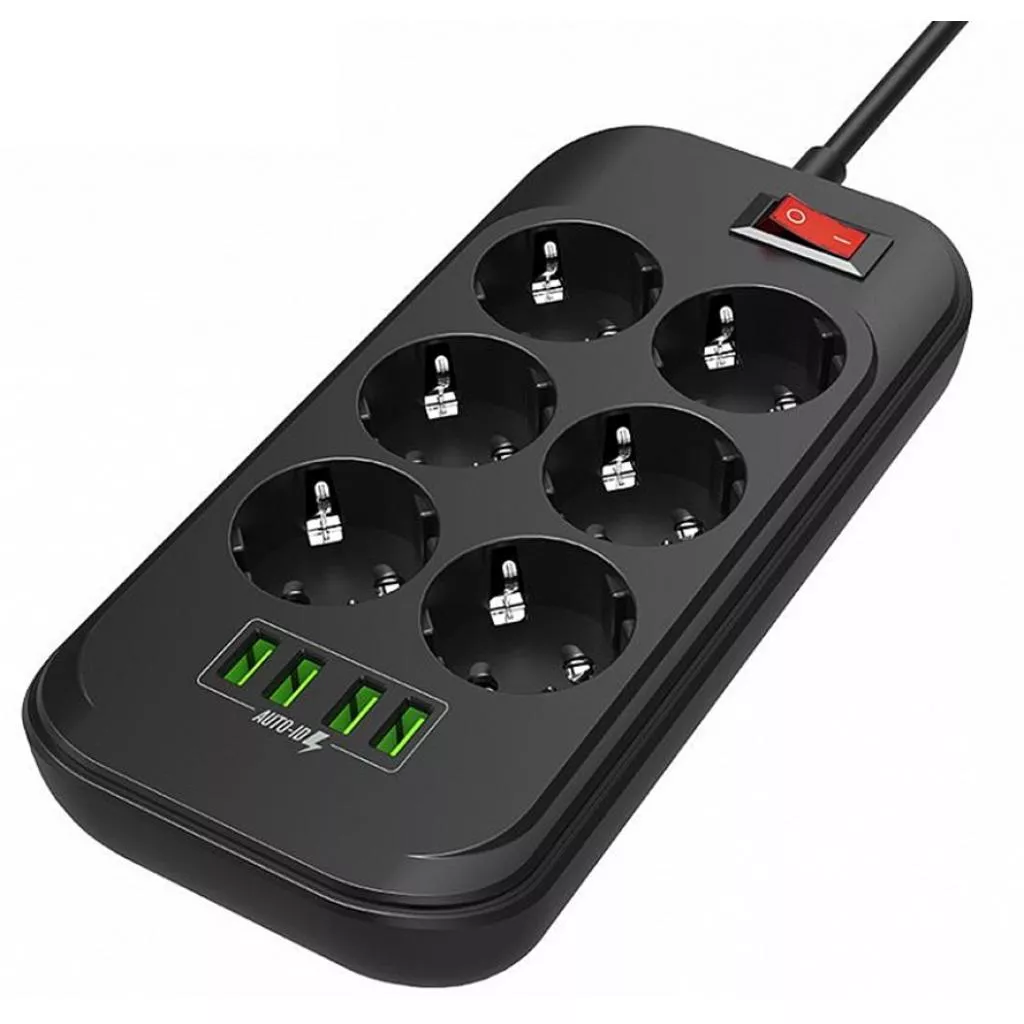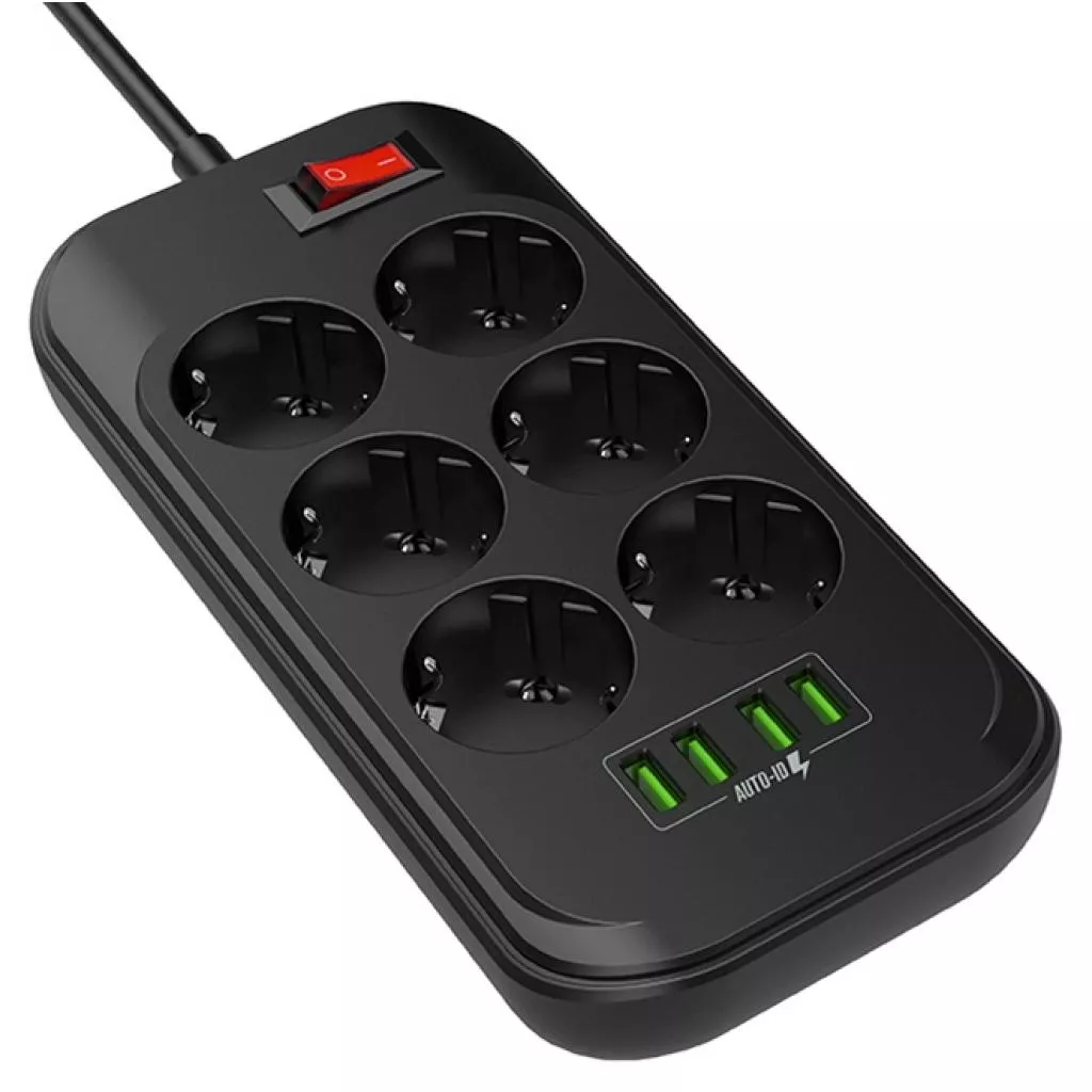 Удлинитель, с шестью сетевыми розетками 220В и 4 USB портами 5В. С его помощью можно подключать не только электроприборы, но и одновременно заряжать до 4 х мобильных устройств: смартфоны, планшеты, внешние батареи и многие другие устройства, которые поддерживают зарядку от USB порта.