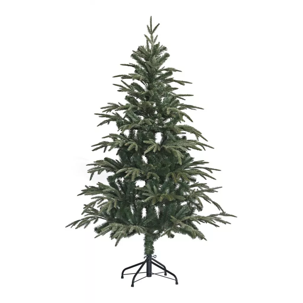 Искусственная ель с литыми ветками максимально подобна натуральному дереву. Все используемые материалы экологически чистые, имеют противопожарные свойства. Большим плюсом искусственной елки является её долговечность, а сборка конструкции не отнимет много времени. Красивое и пышное новогоднее дерево будет ежегодно наполнять дом радостью и благополучием в рождественский период. Материал: ПВХ пленка шириной 6 см; литые ветки; металл; проволока. Высота: 150 см. Диаметр нижнего ряда: 104 см. Ствол ели состоит из двух частей. Подставка ели — это металлическая крестовина с болтами, закрепляющими ствол. Габариты: 1,50 м.