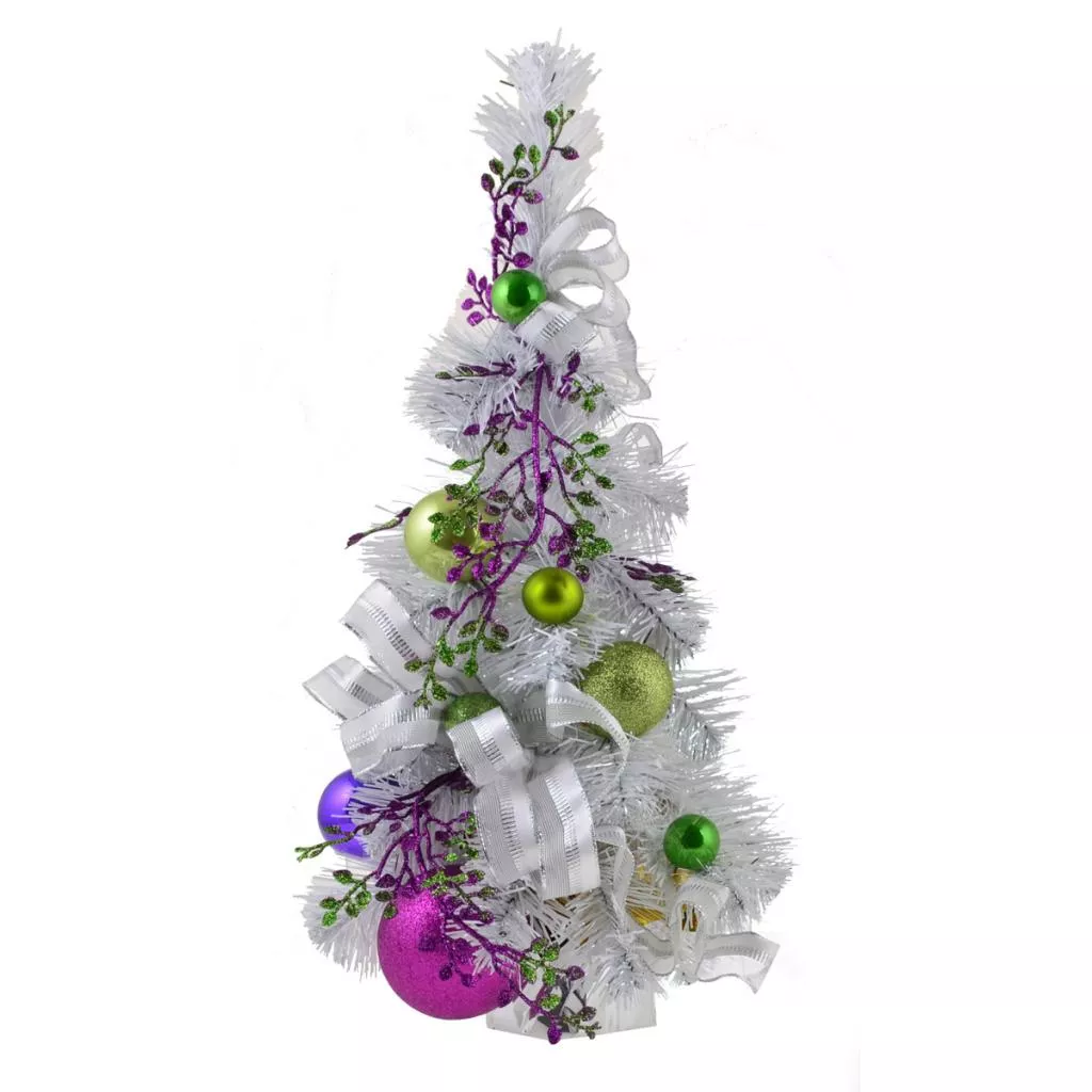 Нежнейшая ель белого цвета, украшенная с одной стороны салатовыми и фиолетовыми елочными шарами и утонченной веткой, выполненной в аналогичных шарам цветах с глиттерной присыпкой. Низ ели украшает объемный бант, выполненный из текстильной ленты с проволочными краями с обеих сторон по длине. Высота композиции: 52 см. Габариты: 0,52 м.