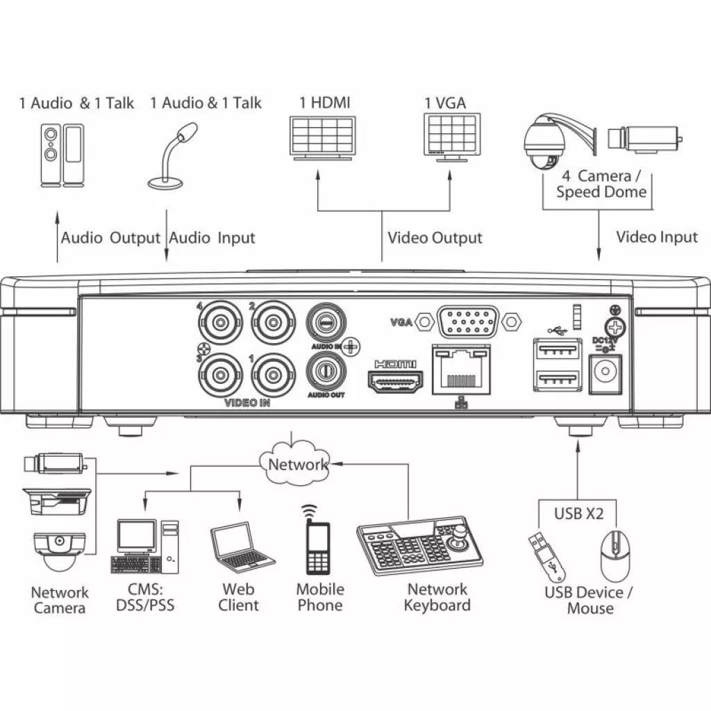 4-канальный DH-XVR4104C-S2 регистратор для видеонаблюдения с различным функционалом работает с 4 аналоговыми с разрешением 2 Mp и 2 сетевыми видеоустройствами с разрешением 2 Mp.