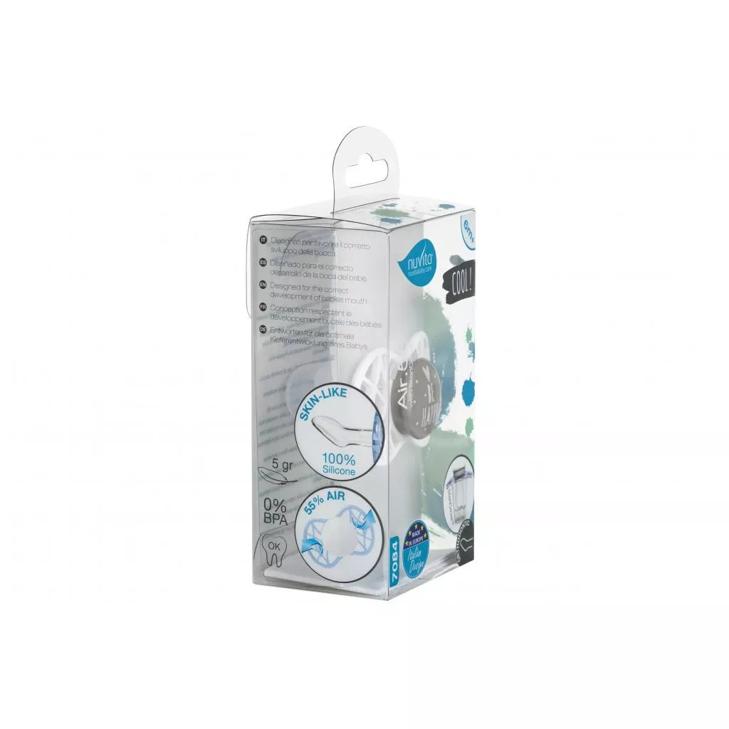 Пустышка ортодонтическая Nuvita Air55 Cool 6m+. Пластинка соски на 55% состоит из воздуха обеспечивая почти полную аэрацию области вокруг рта, избегая скопления слюны, которая может раздражать кожу. Защитный колпачок для соски для поддержания чистоты соски и стерилизации в микроволновой печи простым добавлением воды.