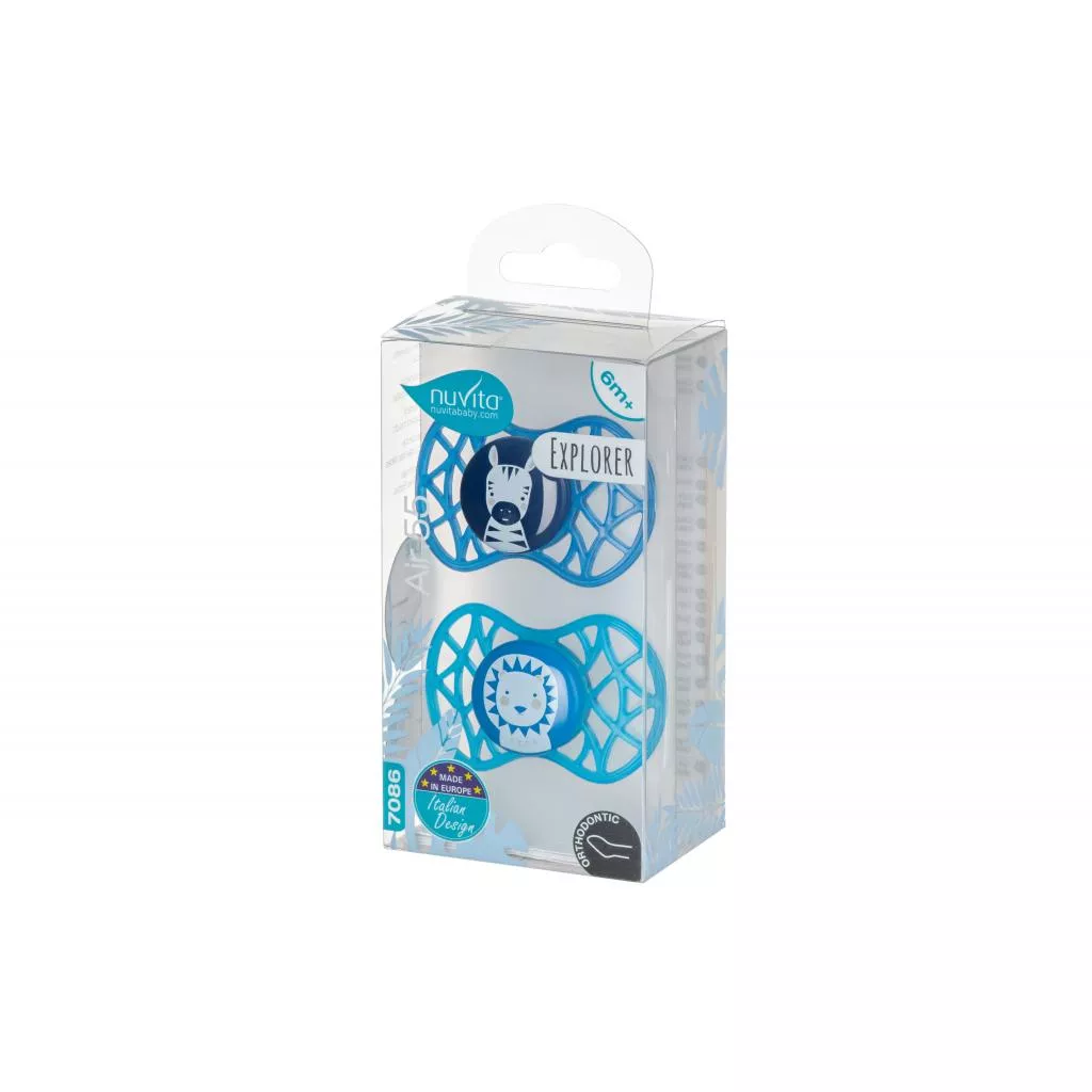 Пустышка Nuvita NV7086 Air55 6m+. Пластина соски на 55% состоит из воздуха, обеспечивая почти полную аэрацию области вокруг рта, избегая скопления слюны, которая может раздражать кожу.