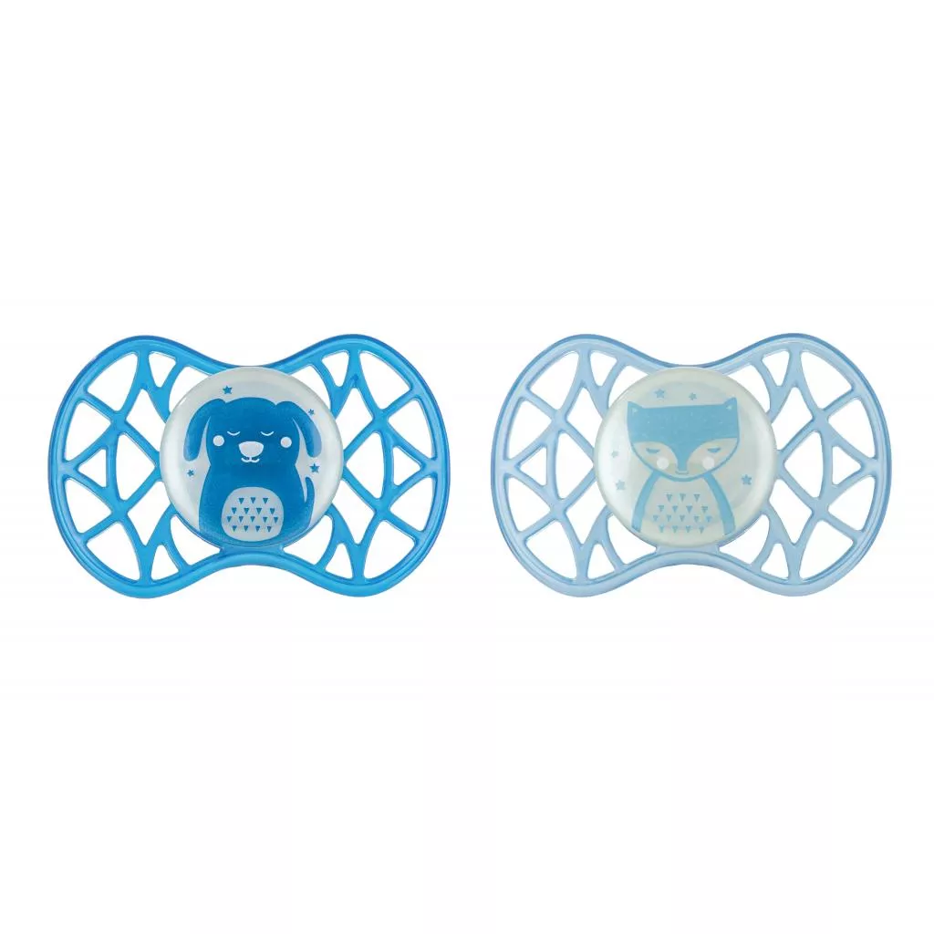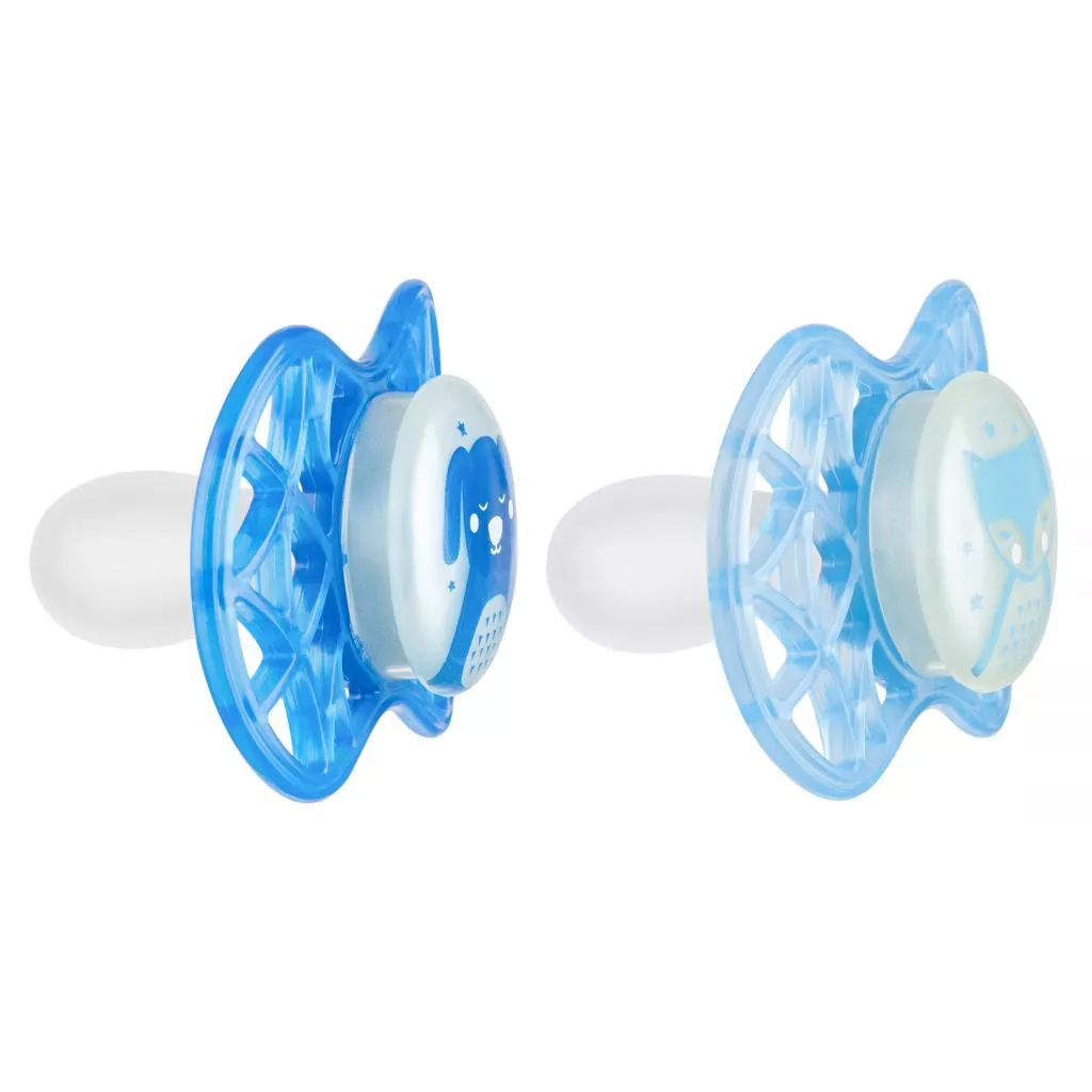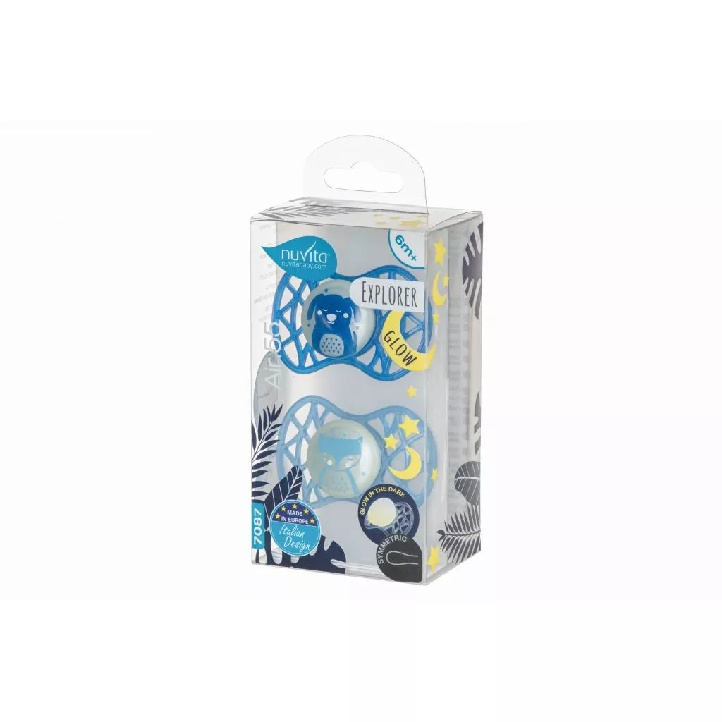 Симметрическая пустышка Air55 Cool, которая светится в темноте. Пластинка соски на 55% состоит из воздуха, обеспечивая почти полную аэрацию области вокруг рта, избегая скопления слюны, которая может раздражать кожу.