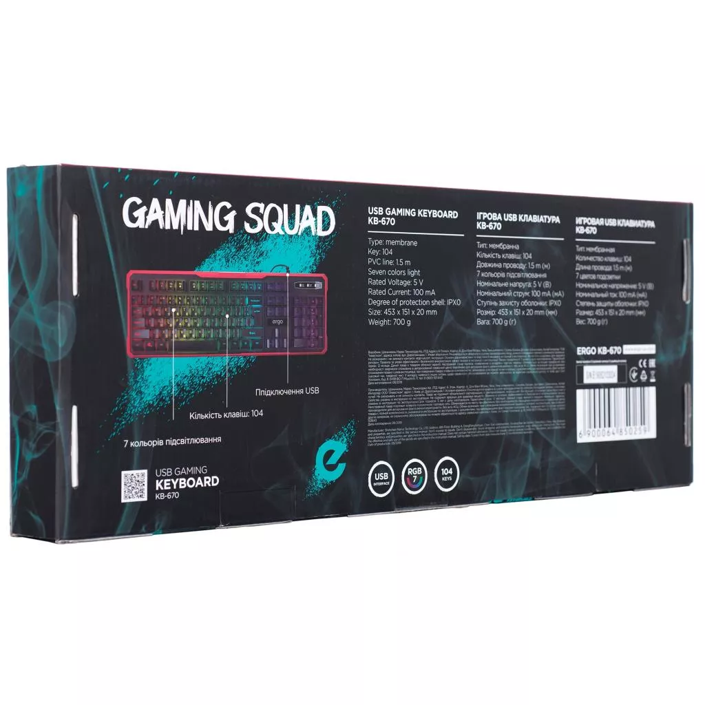 Игровая клавиатура ERGO KB-670 – лучший выбор для тех, кто любит динамичную игру. Стильная и эргономичная модель со скругленными углами займет оптимальное пространство на игровом столе и станет незаменимым помощником для начинающих и профессиональных геймеров. Мембранная клавиатура оснащена 104 клавишами, которые обеспечивают комфортную игру или набор текста.