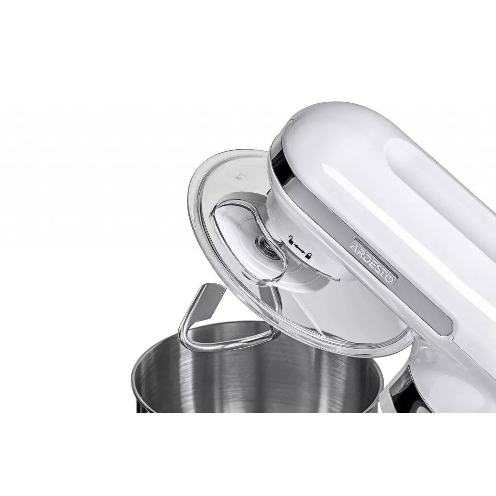 Миксер выполнен в эргономичном корпусе из прочного пластика и дополнен хромированными элементами. Чаша на четыре литра изготовлена ??из нержавеющей стали, а насадки — как из пластика, так и из металла. Венчик и А-образная насадка предназначены для взбивания крема и других ингредиентов с жидкой консистенцией, а крючок для замеса теста. Прозрачная съемная крышка защищает от брызг, а для извлечения насадок есть специальная клавиша. Двигатель мощностью 800 Вт защищен от перегрева, предусмотрено шесть режимов скорости, а также режим Pulse. Для управления используется удобный рычаг, а для устойчивой установки есть ножки-присоски.